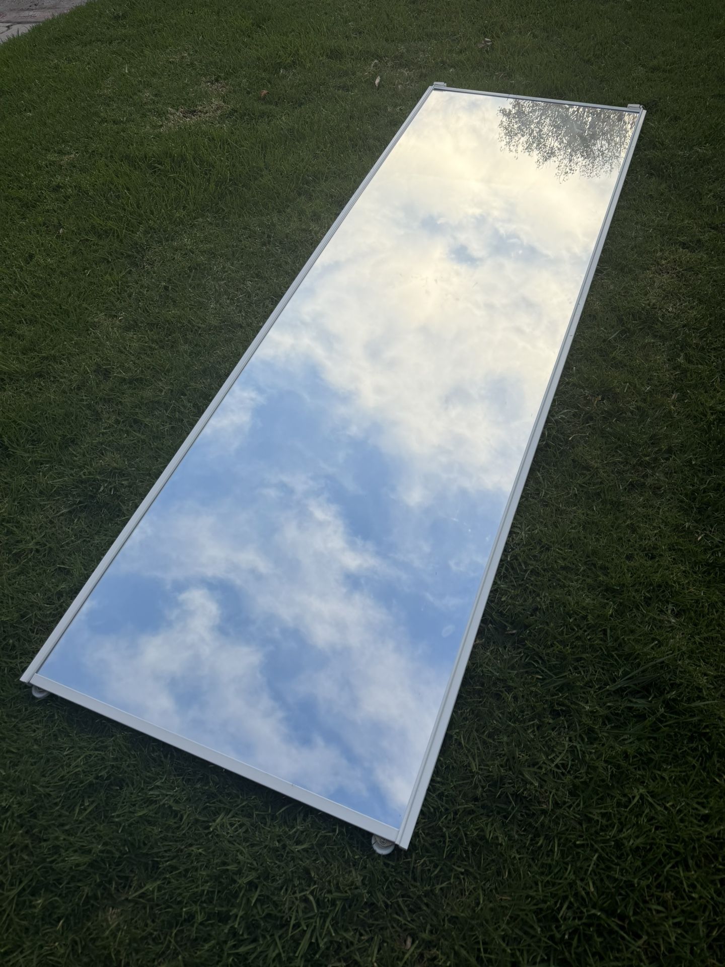 Giving away one mirrored closet door that is designed to roll along a track. The door measures 30 inches wide by 93 inches tall and is 94 inches tall including the wheels and brackets. The mirror is in good shape with no cracks or major blemishes. Located in Ocean Beach near Correia Middle School.