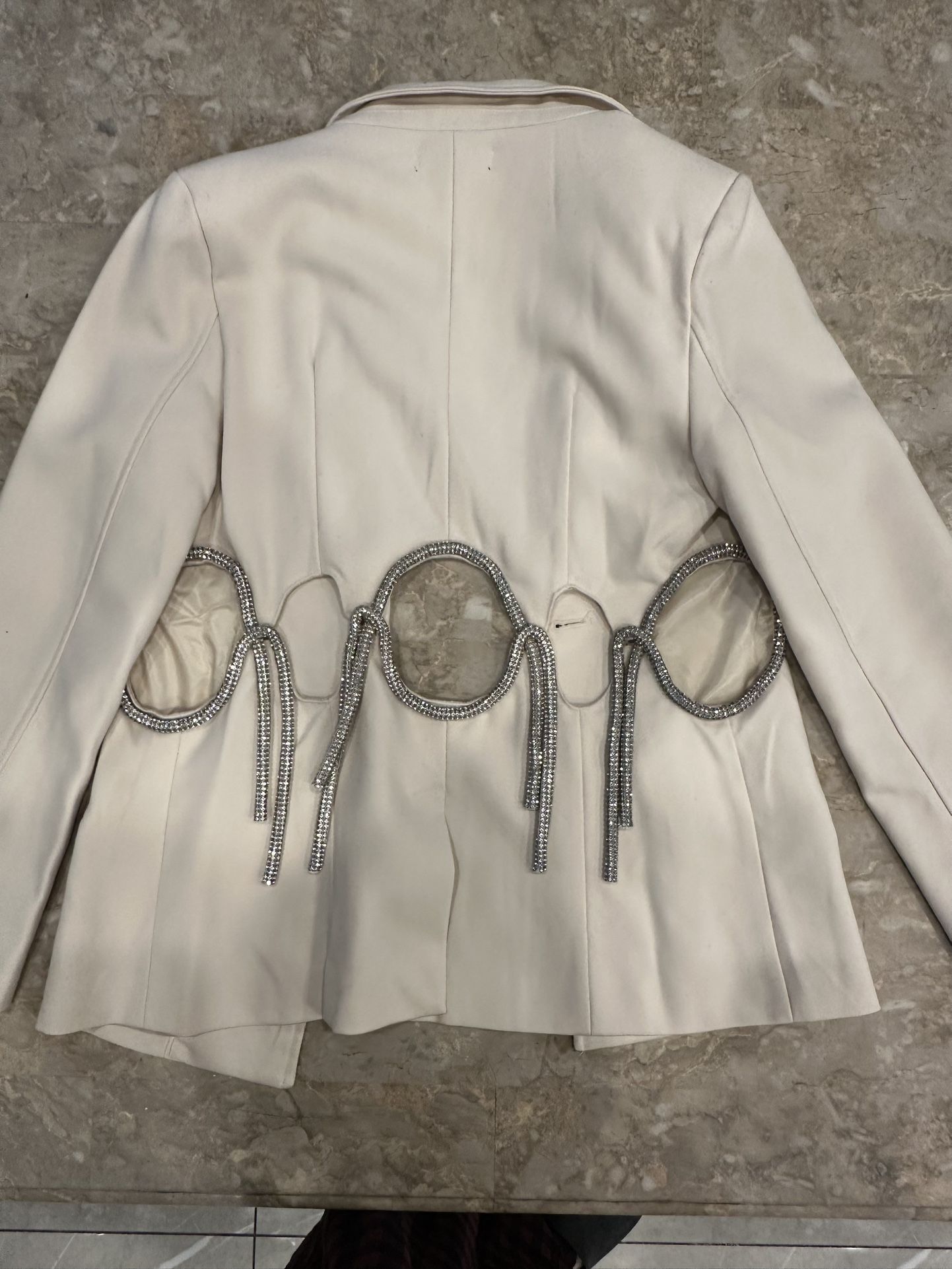 Women’s blazer bought from pop up boutique Size small Crème color very nice with opening in the back with stones New no tags Retails was $350