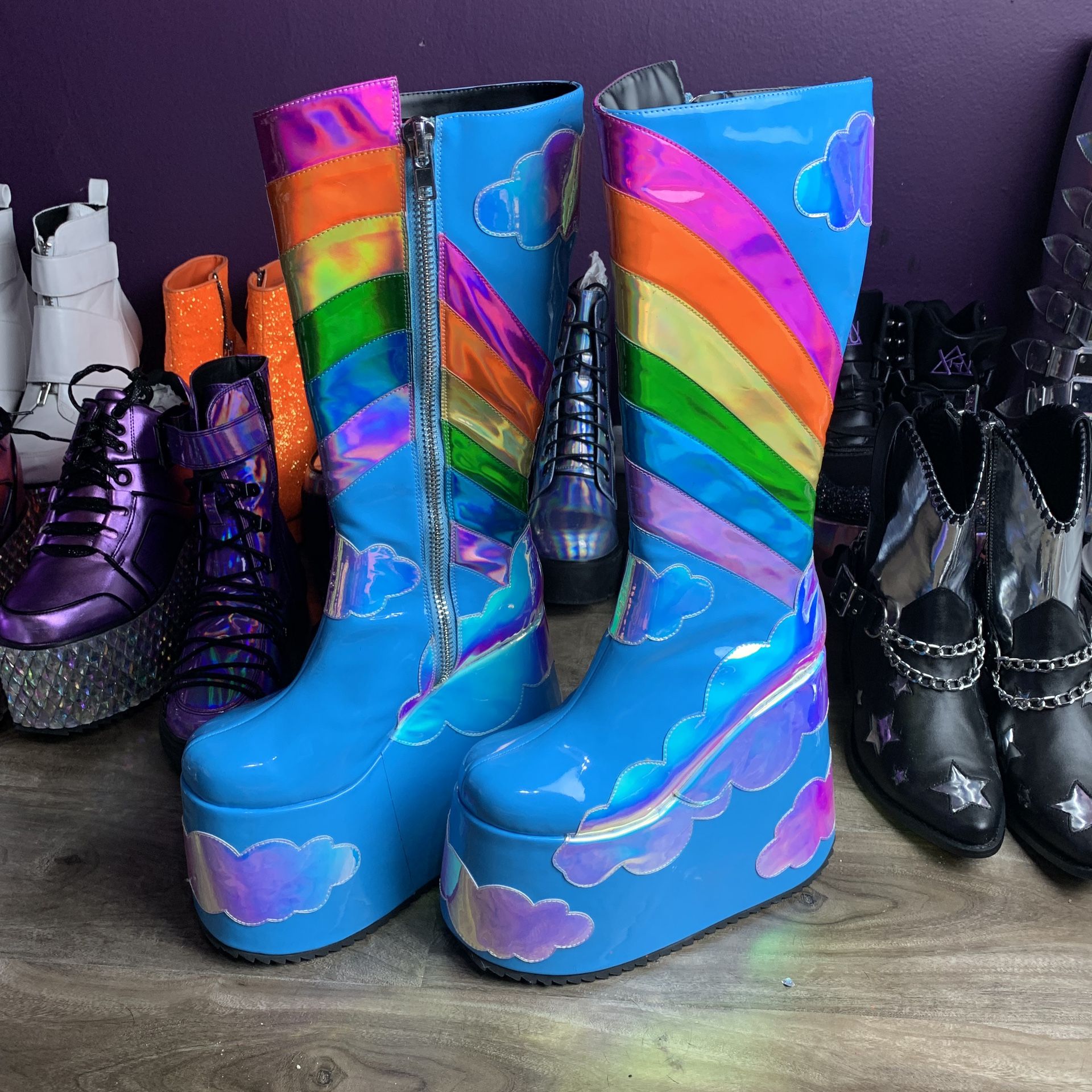 Club Exx Heavenly Horizon Platform Knee High Boots that have metallic rainbow arches, supa cute holographic cloudz, side zip closures, and sky-scrapin’ platformz with treaded soles so you can stay higher than heaven. Rainbow Man Made Materials Hand Clean 6" Heel 3.5" Platform Size 7 Brand New! Sold at Dolls Kill! Offers Considered & Appreciated. Great for festival season (Coachella / Burning Man), raves, costumes. Super comfy!