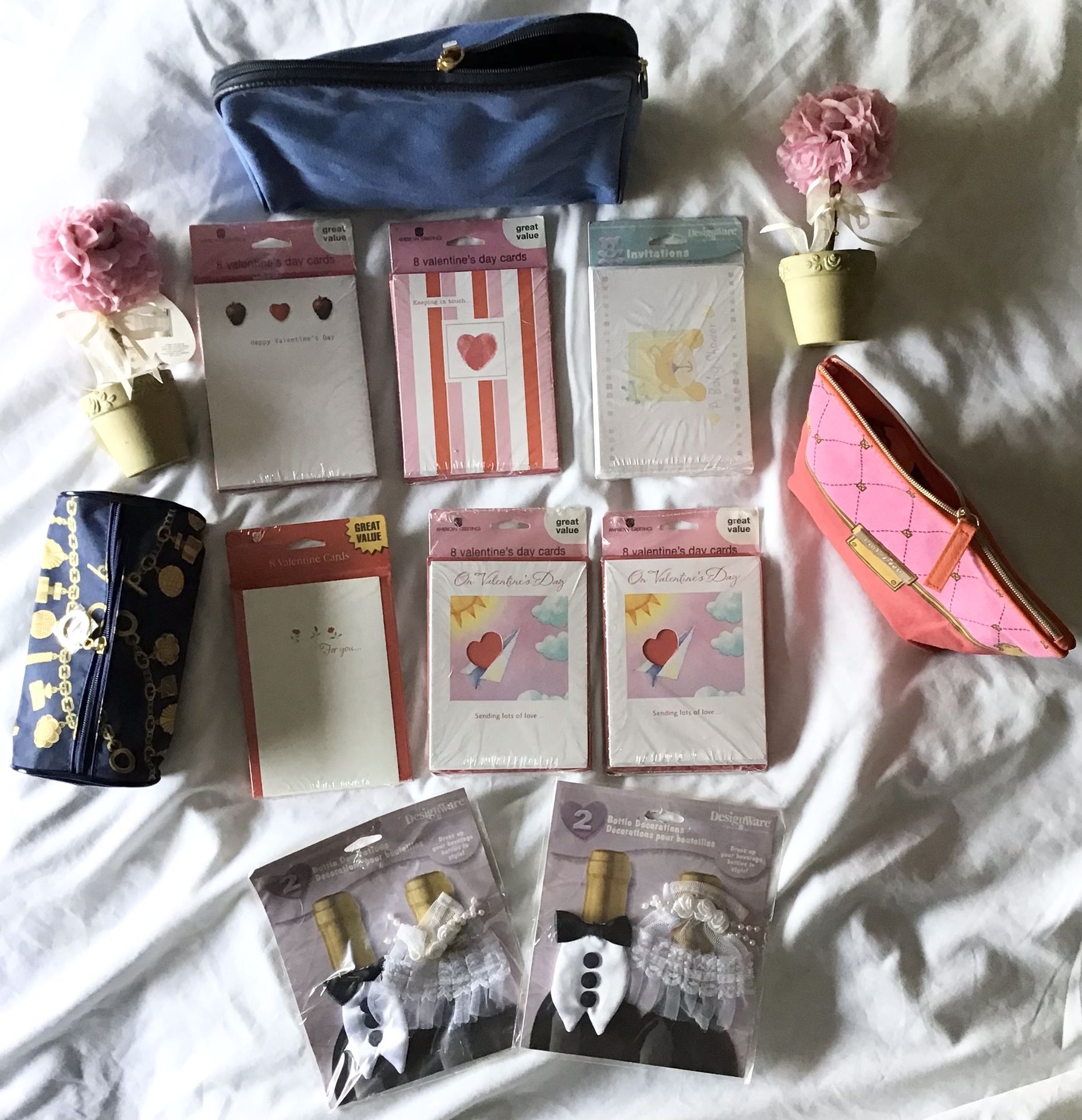 š„Lot Of Miscellaneous Wedding, Valentines, Baby, ETC Itemsš„ In this lot: Set of 2 wedding bottle decorations (dress up your beverage bottles in style) Set of 2 Roses for remembrance approx. 7in H EstĆ©e Lauder red & pink pouch approx. 8.5in W x 6in H EstĆ©e Lauder blue pouch approx. 10in W x 8in H EstĆ©e Lauder blue & gold (charm bracelet design) pouch approx. 7in W x 3in H American Greetings 2 packs of 8 (16) Valentineās Day cards & envelopes (on Valentineās day sending lots of loveā¦because youāre so special happy Valentineās day) (retail $4.99 each) American Greetings Pack of 8 Valentineās Day cards & envelopes (for youā¦..with love and happy wishes. Enjoy yourself on Valentineās Day) (retail $4.99) American Greetings Pack of 8 Valentineās Day cards & envelopes (happy Valentineās Day indulge yourself) (retail $4.99) American Greetings Pack of 8 Valentineās Day cards & envelopes (keeping in touchā¦.and wishing you love and happiness on Valentineās Day) (retail $4.99) American Greetings Pack of 8 Baby Shower Invitations cards & envelopes (a baby shower for, date, time, place, given by, rsvp) Need gone!! Have lots more to sell Smoke free home Any questions please message me Please check out my other items for sell Located in North Port