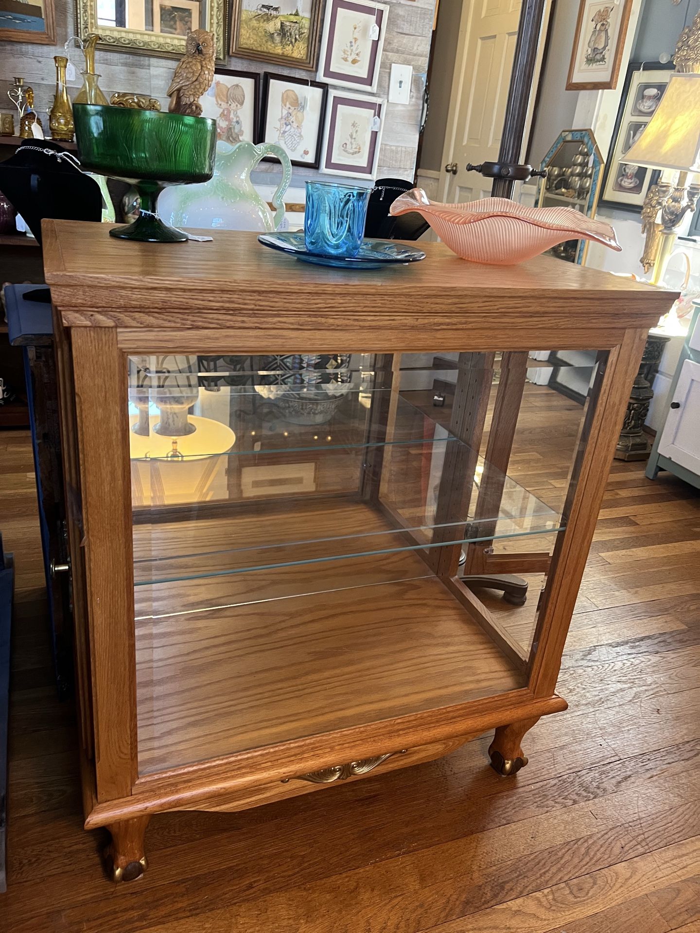 Vintage small solid oak curio with claw feet 34 in
