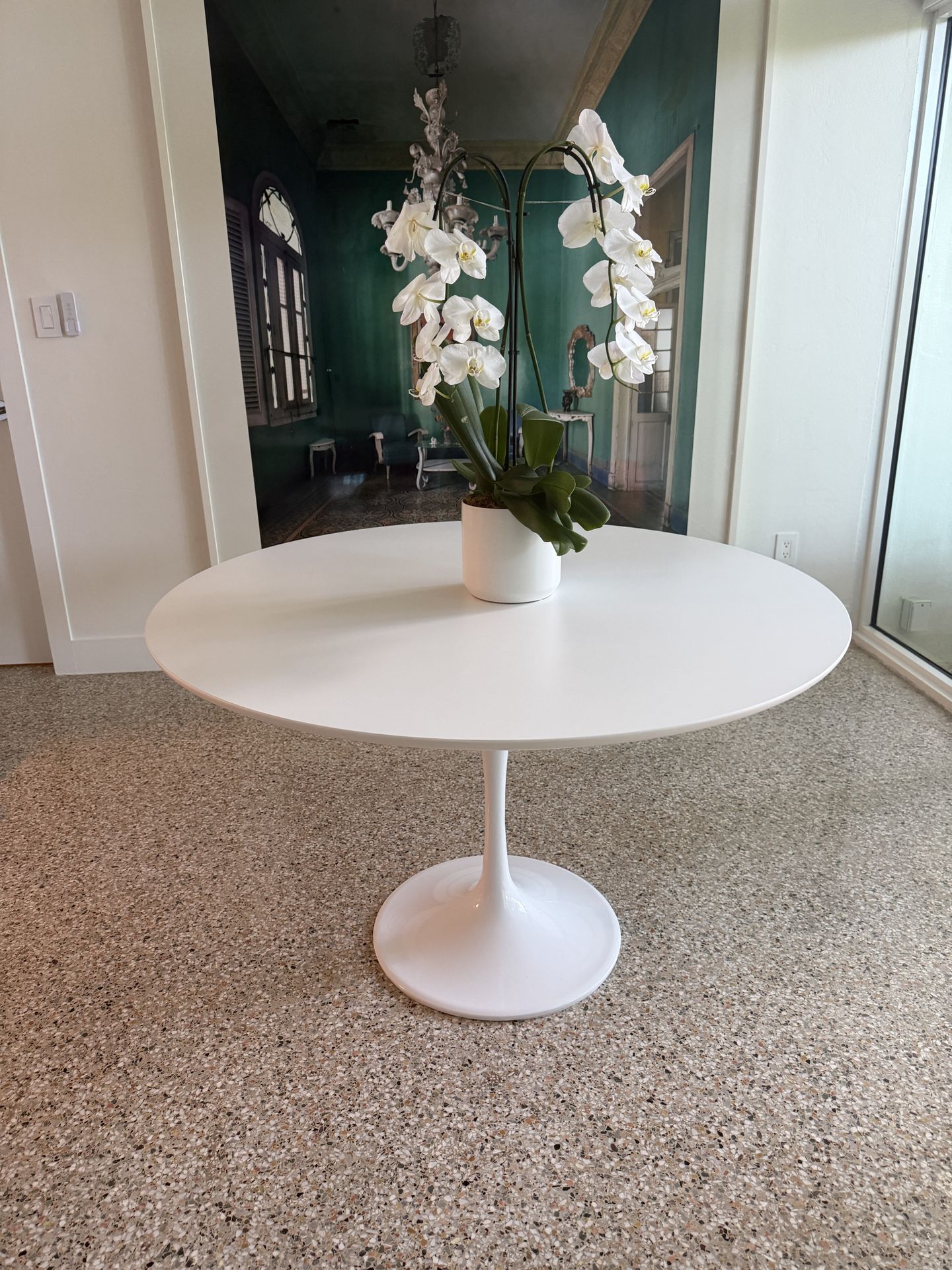 The 48” Rove Concept Tulip table has a lacquer top with satin finish with a beveled underside edge and is in excellent used condition Cast aluminum base with gloss finish Base has 5-step powder coat resistant to chipping come by for easy pick up