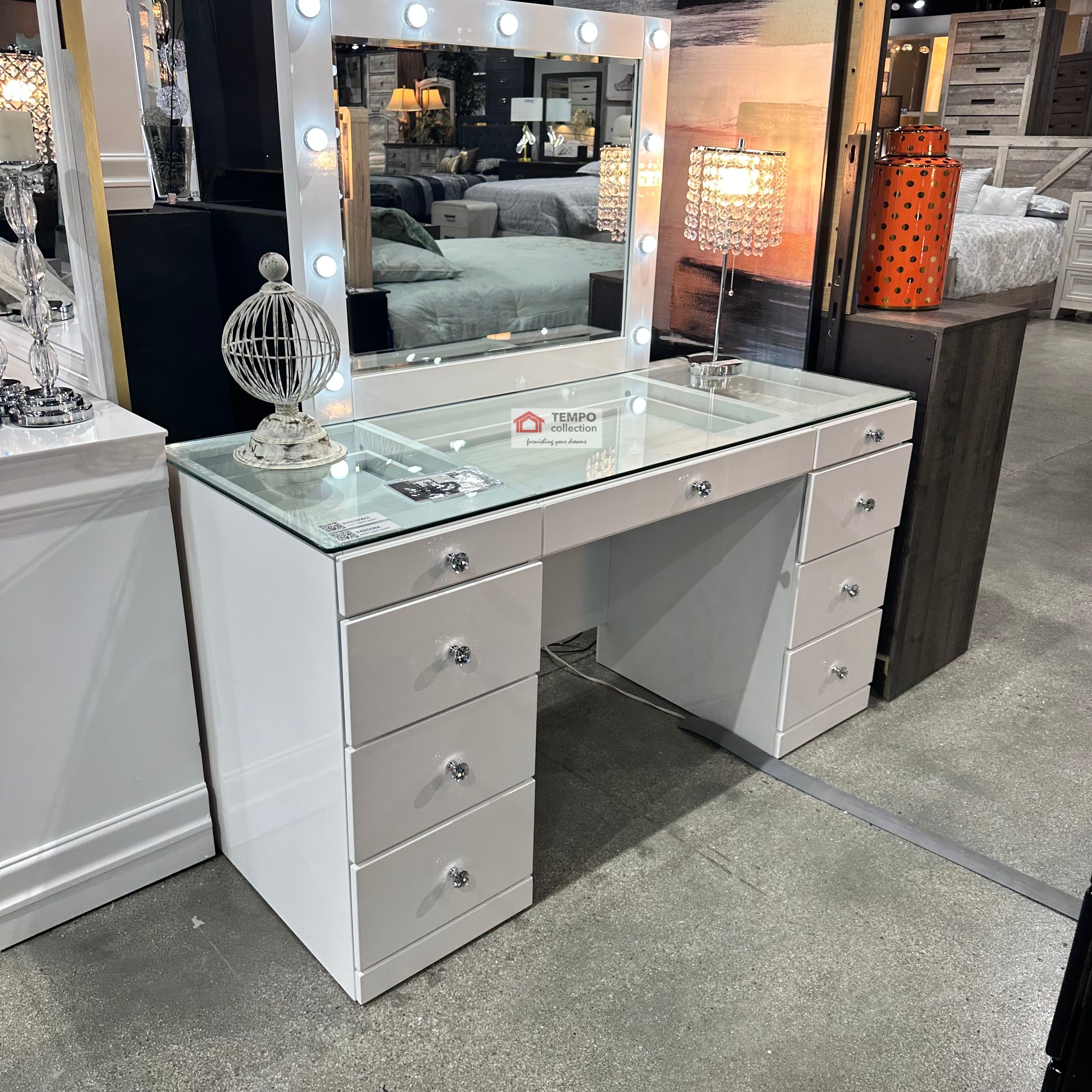 Vanity Set Bedroom Furniture Bedroom Set Bedroom Dresser Bedroom Set Queen Bedroom Furnitire Sets Queen Bed King Bed CalKing bed California King bed Full bed Ikea Tempo Vanity Set with Swivel Stool and Lights NEW in the box. SAME Day Delivery. Delivery and assembly Service available. Cash/Zelle/Venmo, Google Pay, Apple Pay or Credit Cards Accepted. Up to 100 Days-No interest-No Credit Check Financing -SNAP/ ACIMA/KOALAFI. UP TO 24 Months-No interest-SYNCHRONY Financing. Visit our Showroom! Online Shopping Limited quantity, please check availability. SHOWROOM: 1503 E McFadden Ave. Santa Ana, CA, 92705-Phone: (562) 382-4994 Dimensions: Table 57.2" X 23.2" X 31"H Stool : 18" X 12" X 18" SKU#10-B4850WH-SET