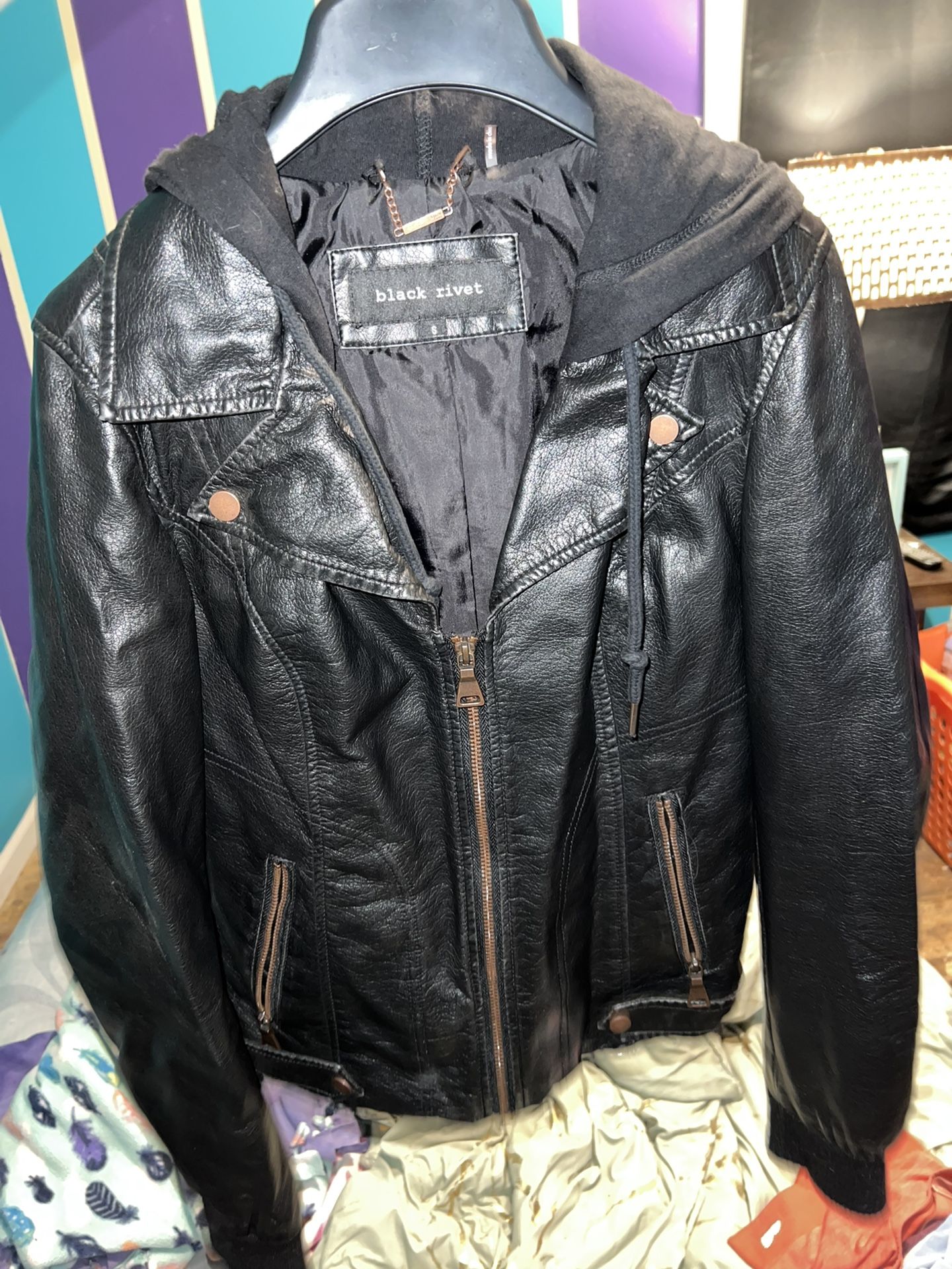 Size small. I will clean off the dog hair from the hood before shopping. Brand new; only worn maybe like 5 times. Originally about $250 from a leather jacket store at an outlet mall.