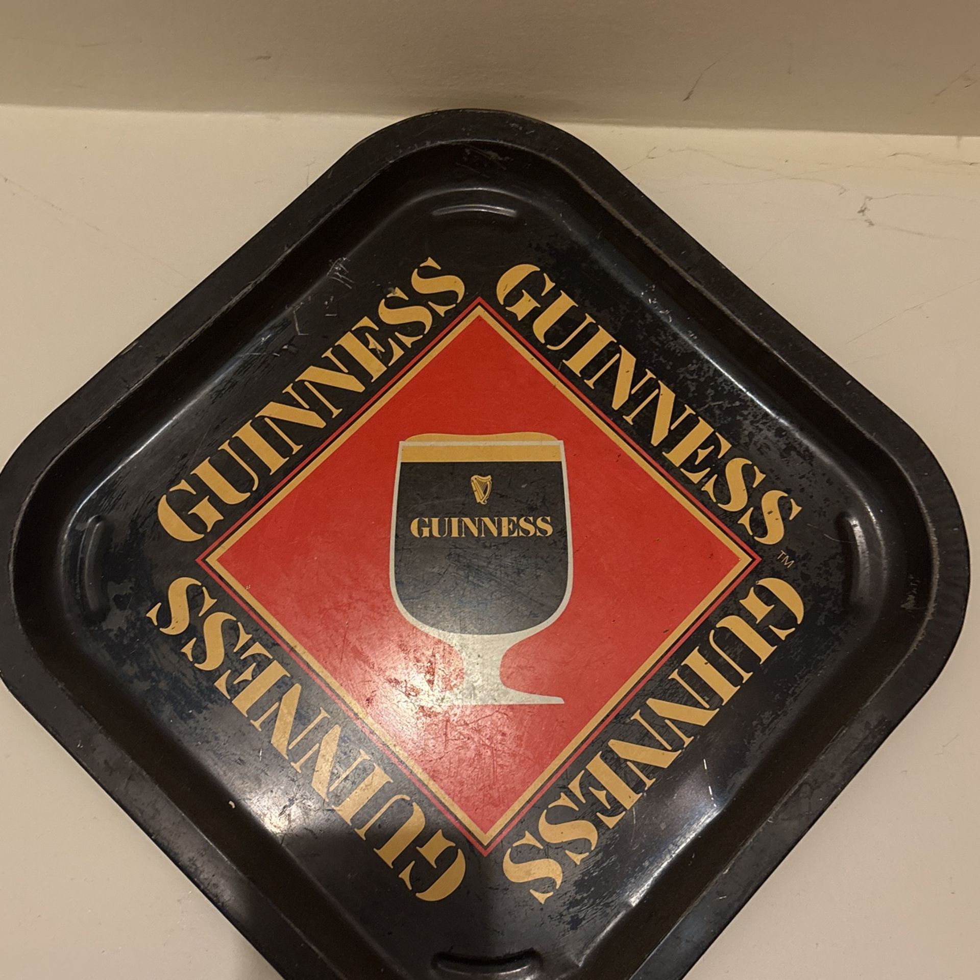 The image shows a vintage Guinness serving tray. Helpful information: It is a collectible item, from the mid-20th century. The tray is made of metal and features the classic Guinness logo. It was used in pubs and bars to serve drinks. The tray is a popular item for collectors of breweriana. It is a piece of Irish advertising history.