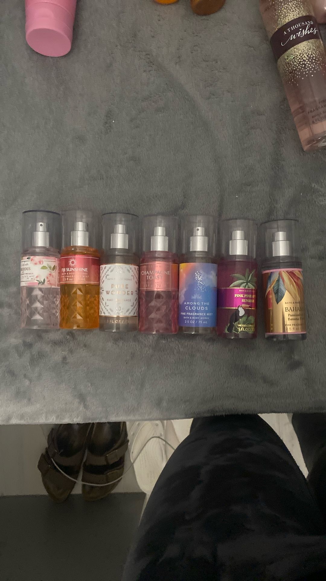 $2 each. Mini of gingham gorgeous, Fiji sunshine, pure wonder, champagne toast, among the clouds, pink pineapple sunrise, and Bahamas.