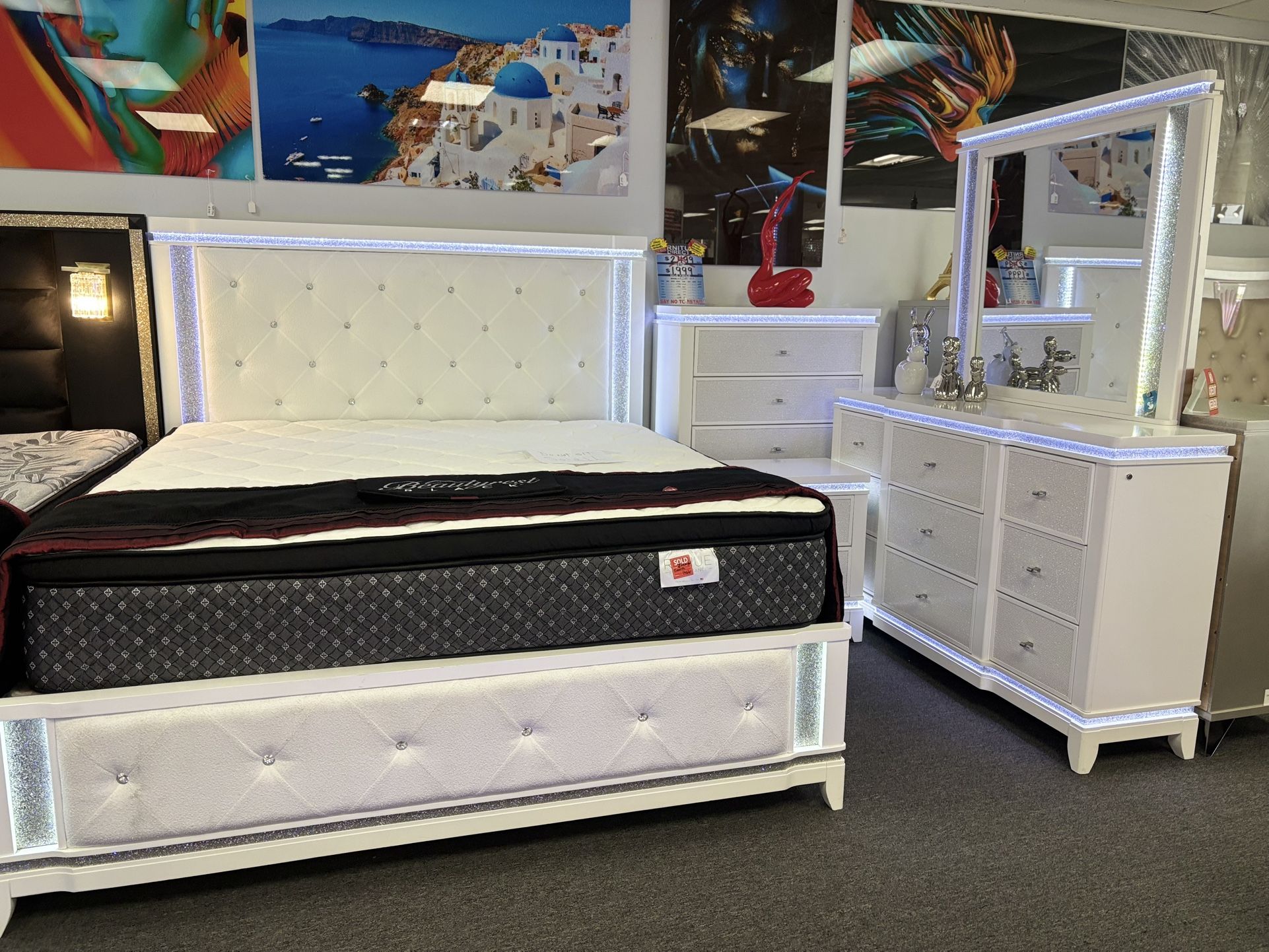 White 5pc bedroom set w/led lights and glitter accents for sale! Brand new and ready to go. Features a FREE MATTRESS AND A FREE NIGHTSTAND! Send me a message for more info