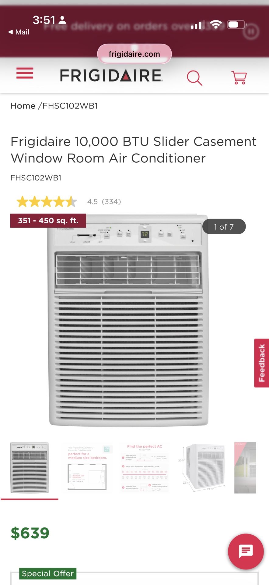 Purchased new and only used for a short while. Works well. Paid $632. Asking $100 obo. Overview & Features This 10,000 BTU Window AC is designed for homes with slider casement windows Multi-Speed Fan Effortless™ Temperature Control Remote Control Programmable 24-Hour On/Off Timer Sleep Mode Automatic Restart Ready-Select® Controls Electronic Controls Adjustable Side Panels Extra Long Power Cord Easy-to-Clean Washable Dust Filter Clean Filter Alert