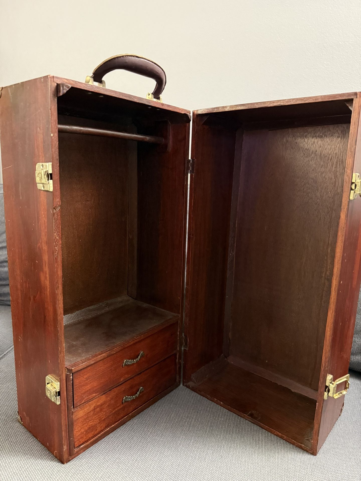 Vintage wooden wardrobe trunk for an 18" doll such as American Girl. This travel-style doll closet features a hanging rod for clothes and two small drawers for accessories. The case opens like a wardrobe and includes a carry handle and metal latches. Condition: Pre-owned vintage condition with visible wear such as scratches and scuffs from normal use. The drawers slide properly and the structure is solid. Please review all photos for exact condition. Approximate size: • Height: about 20 inches • Width: about 11 inches Great storage piece for doll clothing or a nice addition to an American Girl doll collection.