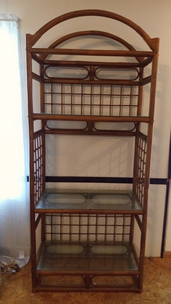 1970 Vintage Bamboo Rattan Etagere (Display Case/Bookshelf) w/ Glass Shelf Inserts