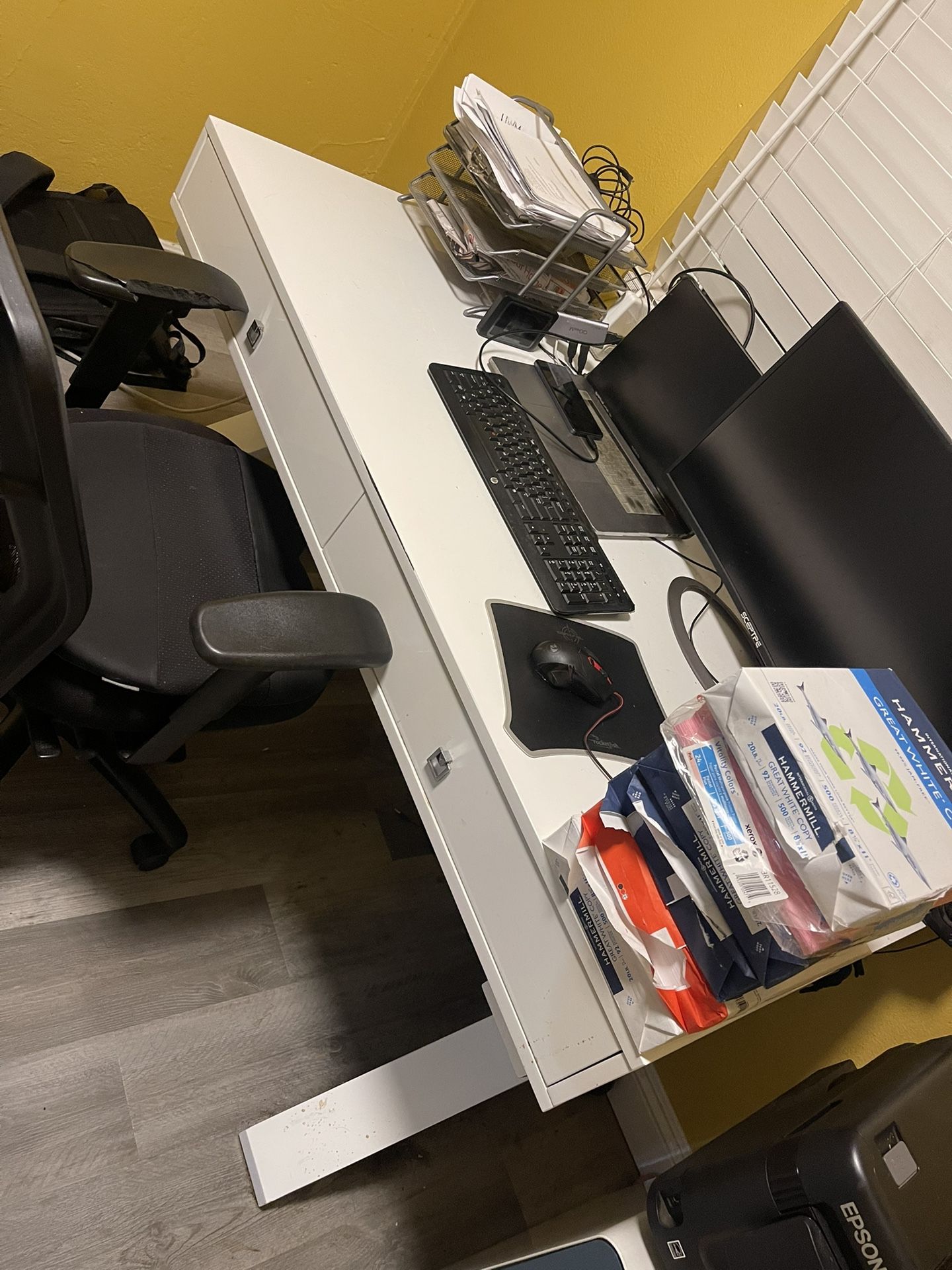 My Move Overseas is your Gain Office Desk with Supplies Everly High Gloss Desk (it is $600 New) With Two Drawer File Cabinet Epson Ww-7710 ALL IN ONE Printer ($600 New) Reims of Printer Paper Plus other Office Stuff added ALL YOURS $300 or Give Your Best Offer Printer needs a Trip to Geek Squad and clean heads Been in storage First Come First Serve No Laptop / monitor