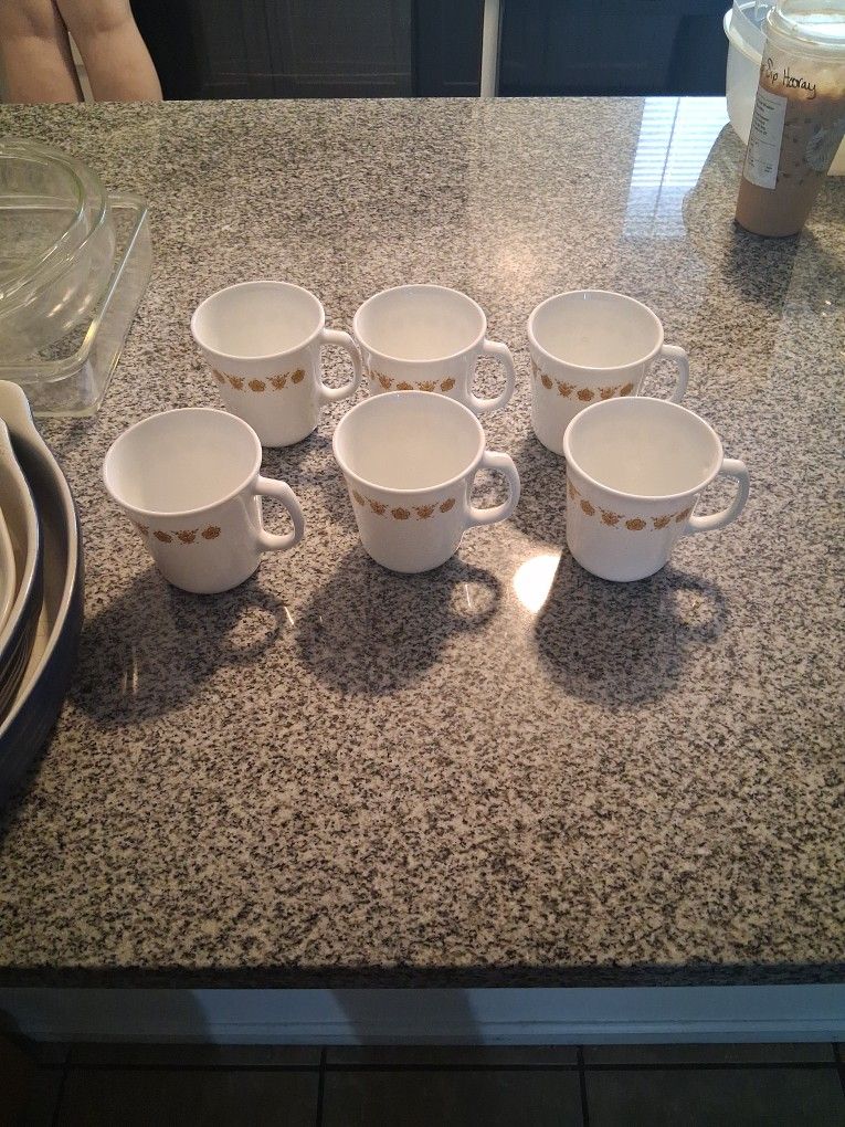 Vintage Corning ware mugs ×6 Clear Pyrex mixing Bowles/ baking pans ×4 Other vintage baking dishes ×4 Tuxton butter dish ×1 Rachael Ray dishes ×2 the bigger one has broken handle Flower glass strainer ×1