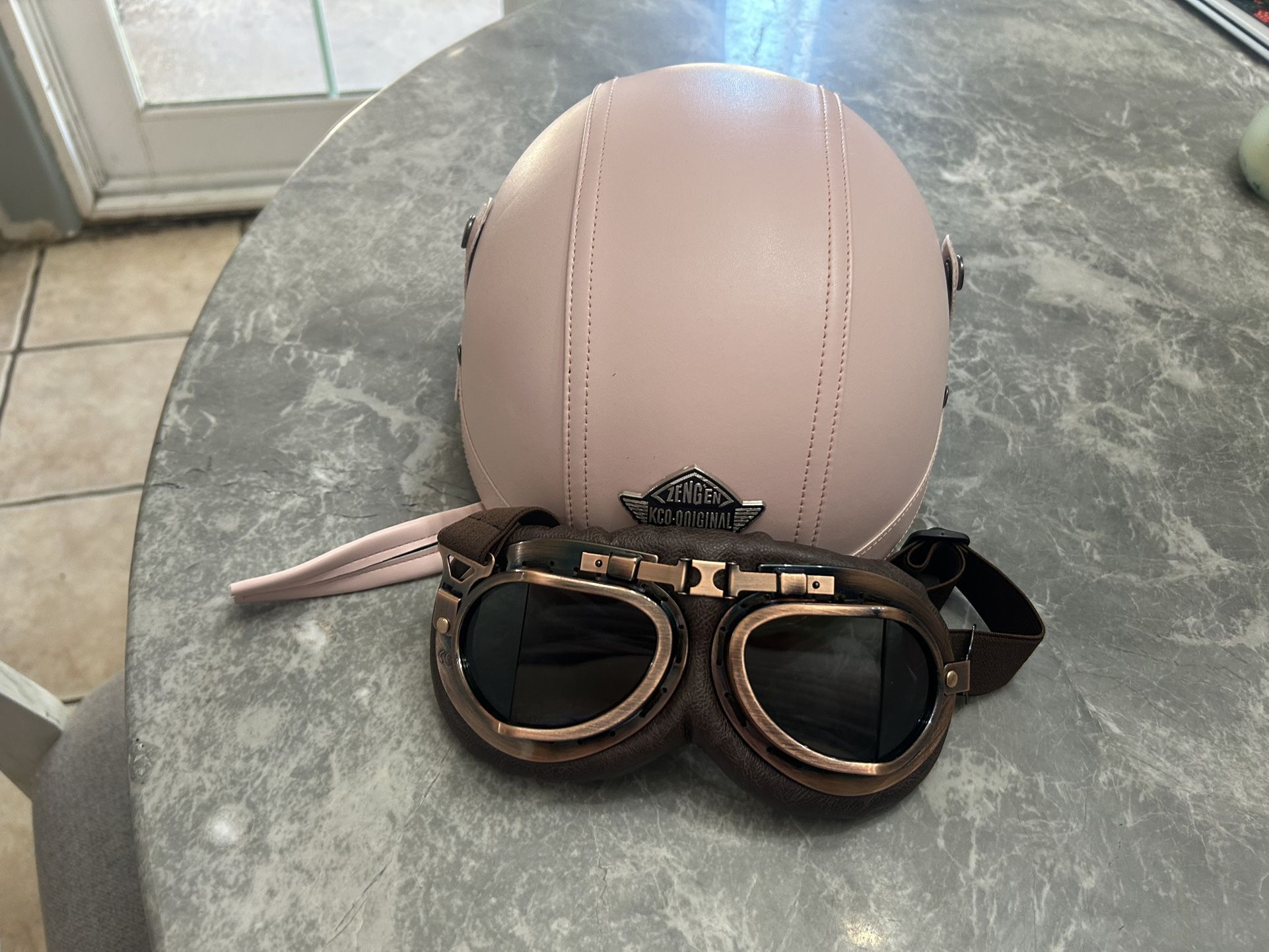 Motorcycle Half Helmet Retro German Handmade Leather Half Face Quick Release Buckle & Goggles - DOT Approved (Pink, M) New never been used only been open.