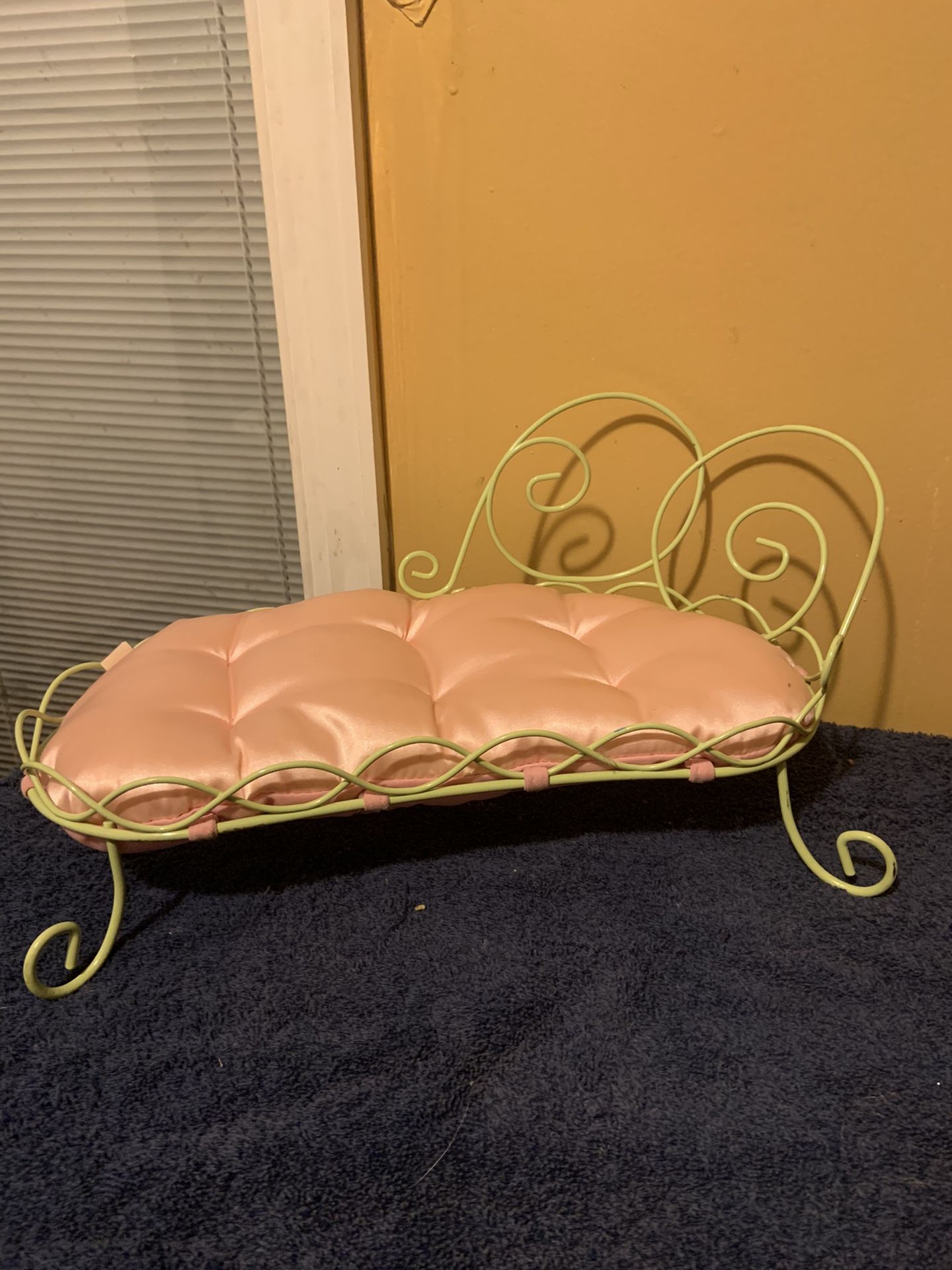 Groovy girls decorative seat . Doll not included. Yellow- green metal color which is peel in some parts and pink cushion .