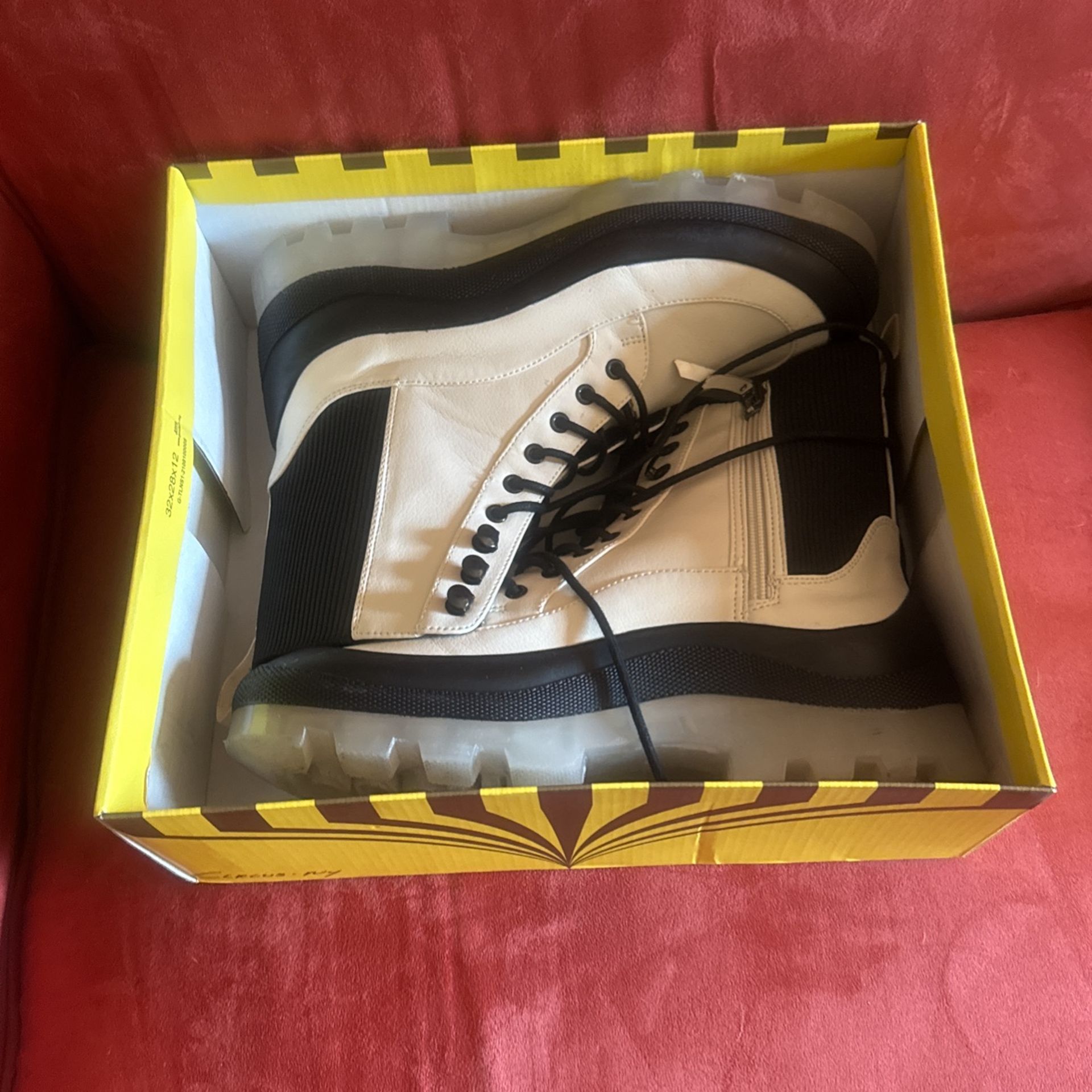 Cream and black boots so is clear black string up high top boots never worn brand new.