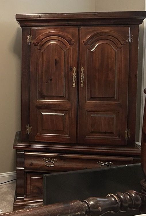 Queen bed, armoire, two bedside tables. Good condition (some scratches), solid wood. Cash only.