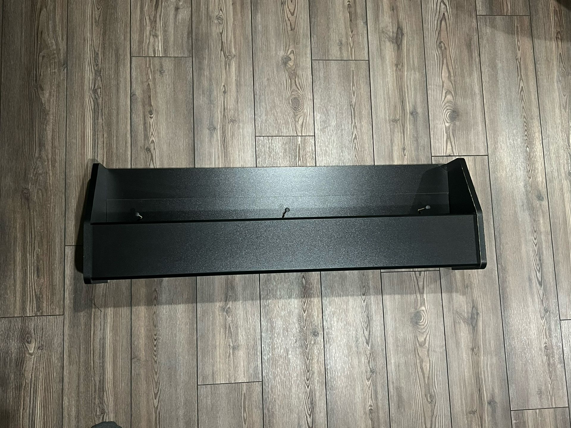 Simple black shelf for wine or liquor bottles. Mounts to wall very easily, holds 12 or more wine bottles on top, and a slot for multiple glasses to hang underneath. Minor scuffs here and there but in good shape overall. Dimensions: 41”W x 12”H x 8”D Buyer must pick up in NE Portland.