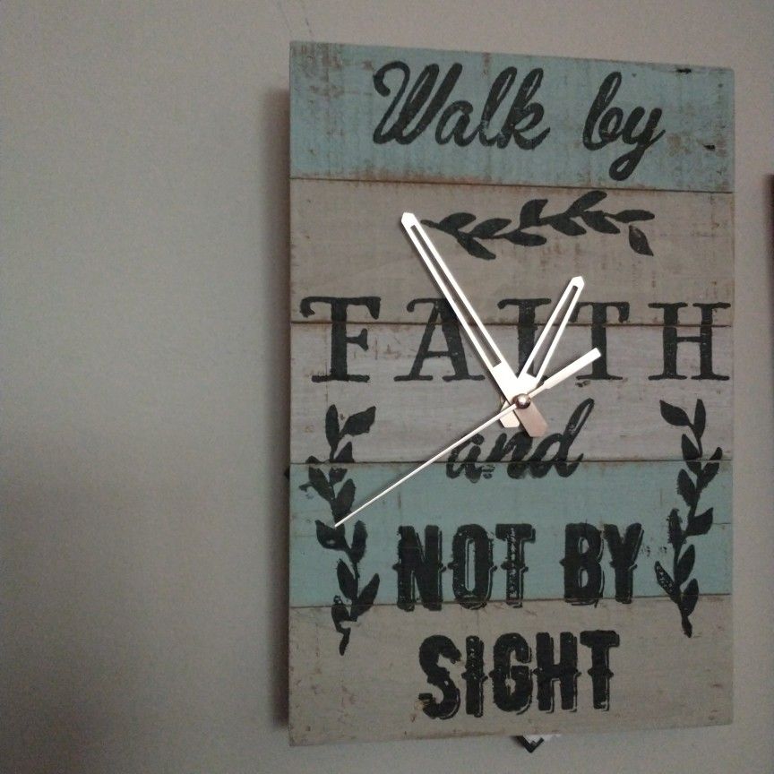 8x12 inches, 1inch deep box takes one AA battery, included Quartz adjusted clock mechanism Multicolor, barn-feel wood planks with quotation, painted dusty black n tan n dusty blue. "Walk by faith and not by sight" hence, no numbers on the clock!