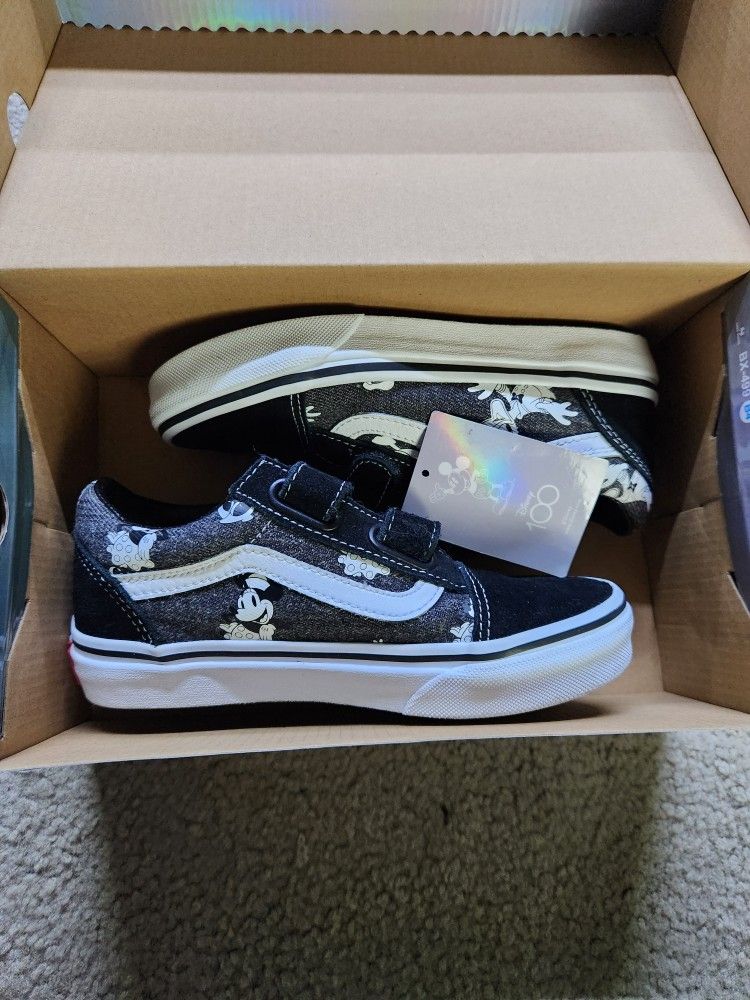 These are old school V 100th anniversary vans. My daughter onky wore them twice before growing out of them. They do run a little bit small. They no longer sell these in stores and are a collectibles item. Comes with the box and tag. 40 FIRM