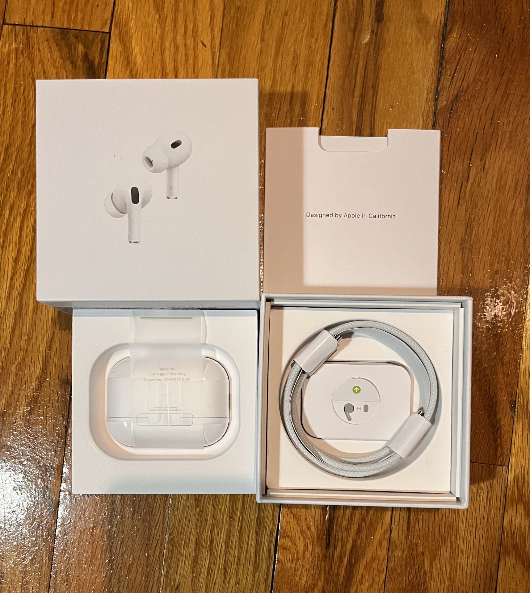This is a set of AirPods Pro (2nd generation) in white color. They are wireless earbuds with a built-in microphone and feature noise cancellation. The earbuds come with a MagSafe case and use Bluetooth wireless technology to connect to your phone. They are opened but like new. Este es un conjunto de AirPods Pro (segunda generación) en color blanco. auriculares inalámbricos con micrófono incorporado y cuentan con cancelación de ruido. Los auriculares vienen con un estuche MagSafe y utilizan tecnología inalámbrica Bluetooth para conectarse a su teléfono. Están abiertos pero como nuevos.