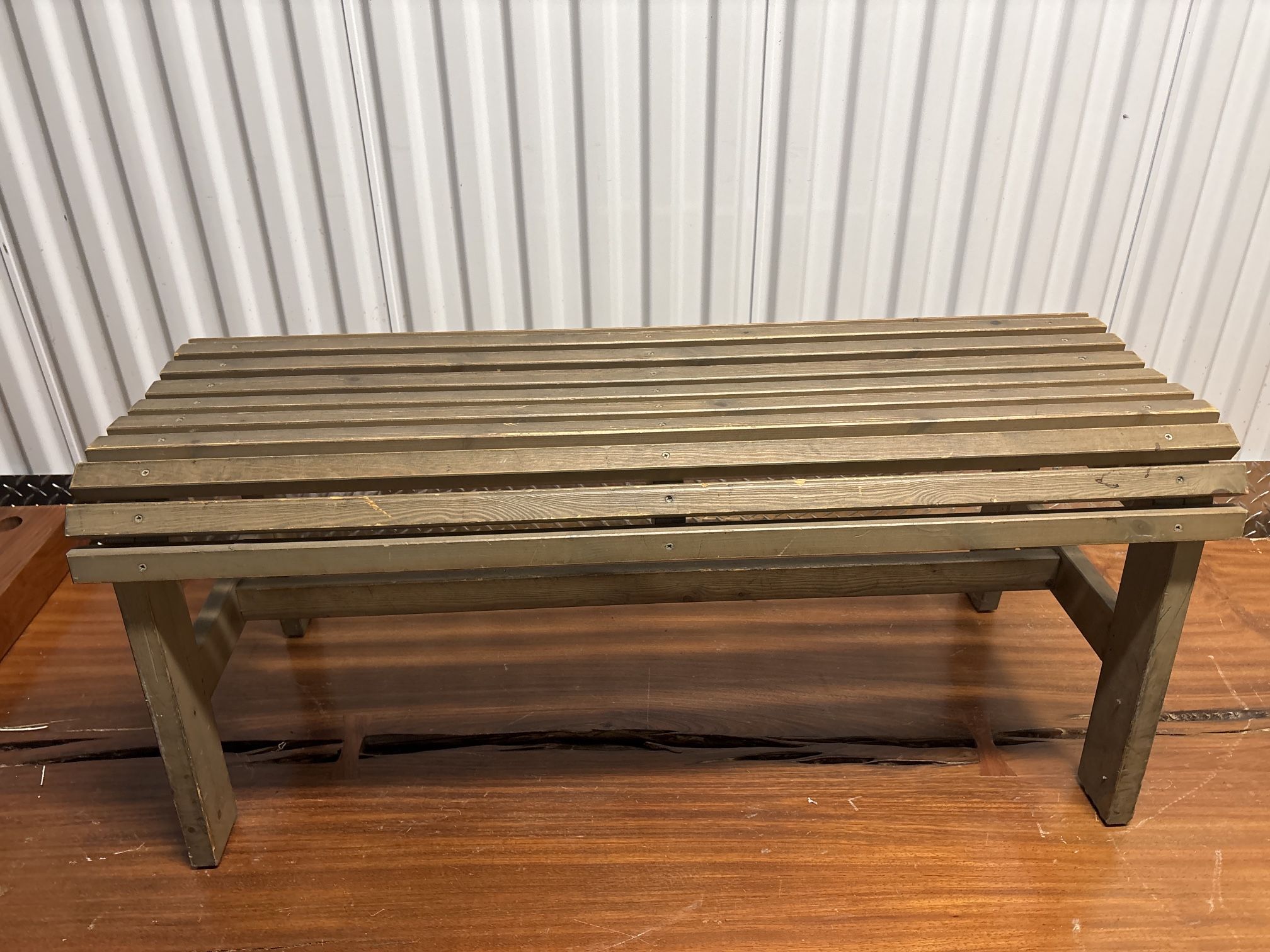 This wooden slat bench offers a rustic charm. It's made of durable wood with a slatted design. Measurements are approximately 39.5 inches long by 16 inches wide by 17 inches tall. It's a sturdy piece for any outdoor or indoor space!