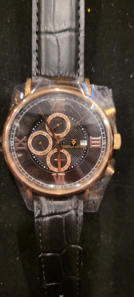 Christian Van Sant Mens CV1127 Somptueuse Automatic Self Wind chronograph Watch Watch has never been worn. Original plastic protection still attached to the watch. No box. Retails for $550.00. Inspired by European works of craft, the Somptueuse Automatic embodies the style, elegance and detail found throughout those historic countries. The Somptueuse, which means "sumptous" or lavish in French, stands as a testament to the value of beauty, quality, design and time. Product Details Origin: Switzerland — Model #: CV1127 — Movement: Automatic — Case Diameter: 42mm — Case Thickness: 22mm — Case Material: Stainless Steel — Crystal Material: Mineral — Dial Color: Black — Water Resistant: 100M — Bracelet Material: Leather — Condition: Like New