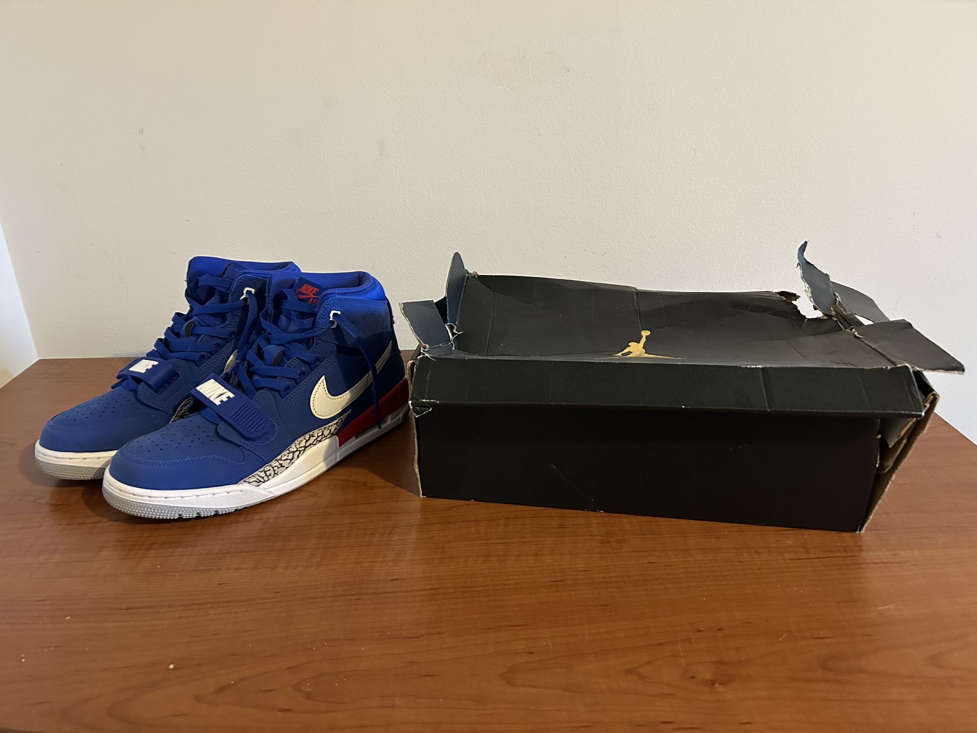 Used like new Jordan legacy 312, “Pistons” design and color way. Been worn once, has no creasing on the left shoe an unnoticeable creasing on the right. Size men’s 10
