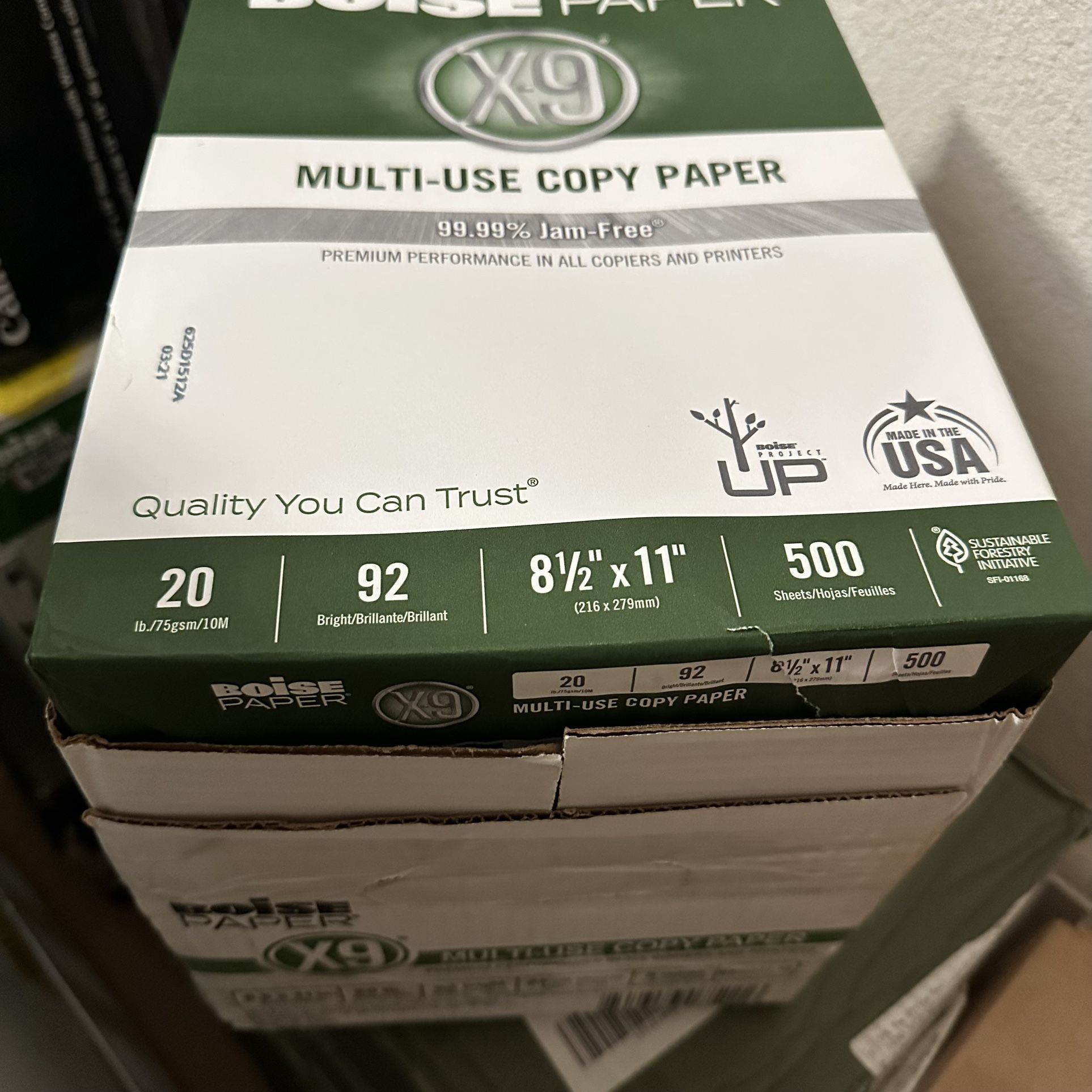 2500 sheets total (5 reams) 8.5×11 inch • 20 lb • 92 brightness Boise X-9 Multi-Use Copy Paper — Made in USA High-quality copy paper for all copiers, laser printers, and inkjet printers. Smooth texture, reliable performance, and 99.99% jam-free. Perfect for: • Office use • School work • Home printing • High-volume users