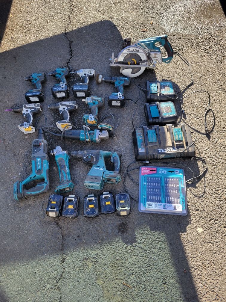 Lot of Mikita tools some brand new some used . It comes with 9 batteries , 2 single chargers , one double charger , 3 drills , 4 impact , 1 roto hammer, 1 sawzall. 1 circular saw , one back of brand new bits never opened , 2 grinders