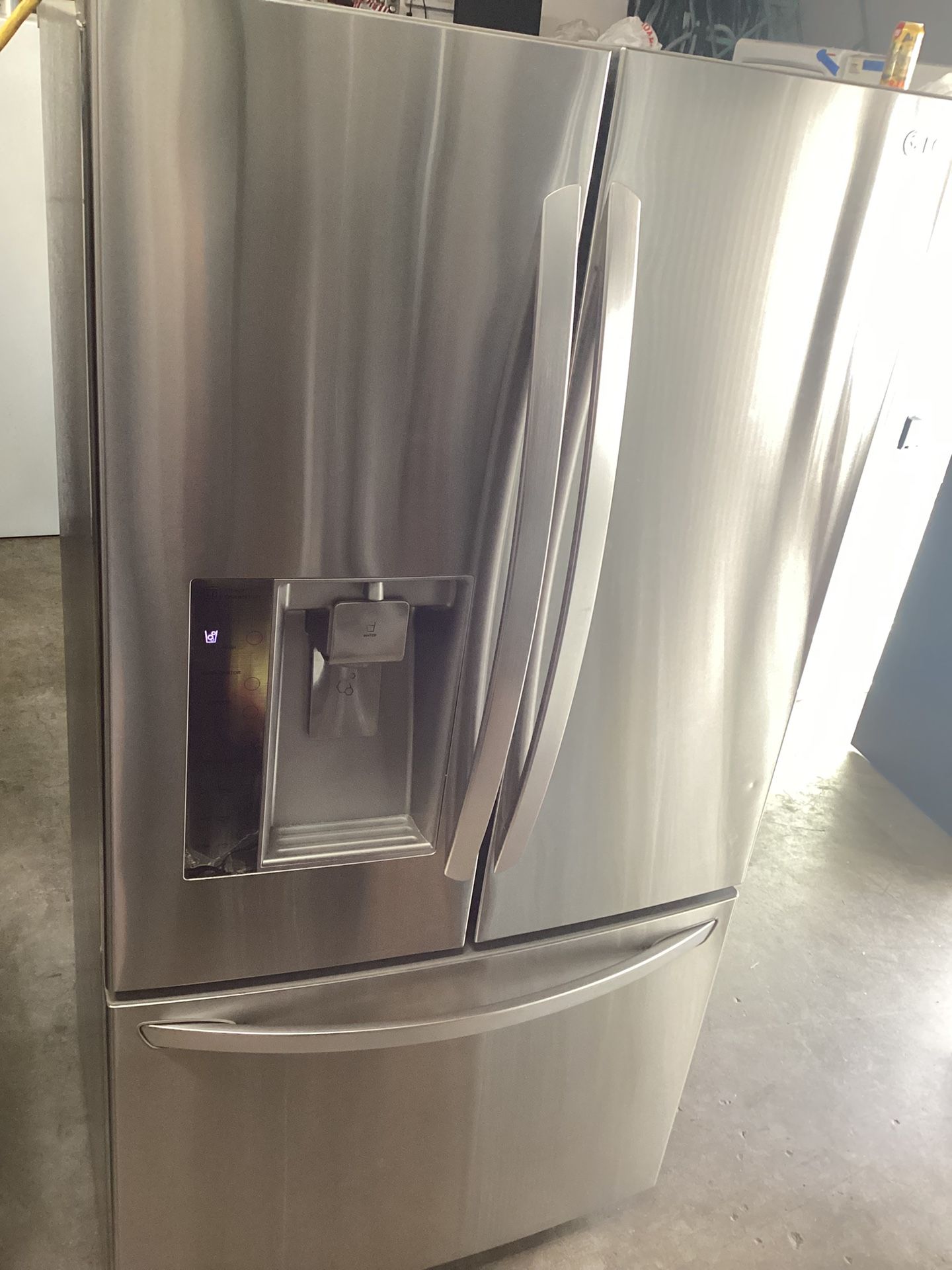 Works good Good condition Stainless steel French doors and drawer for freezer Fresh filter multi air flow Slim space plus ice system The only thing is by the buttons on front door is peeling as shown in picture, but doesn’t affect the way. The refrigerator works. Height…70 1/4 in Width…35 3/4 in Length… 30 7/8 in $300
