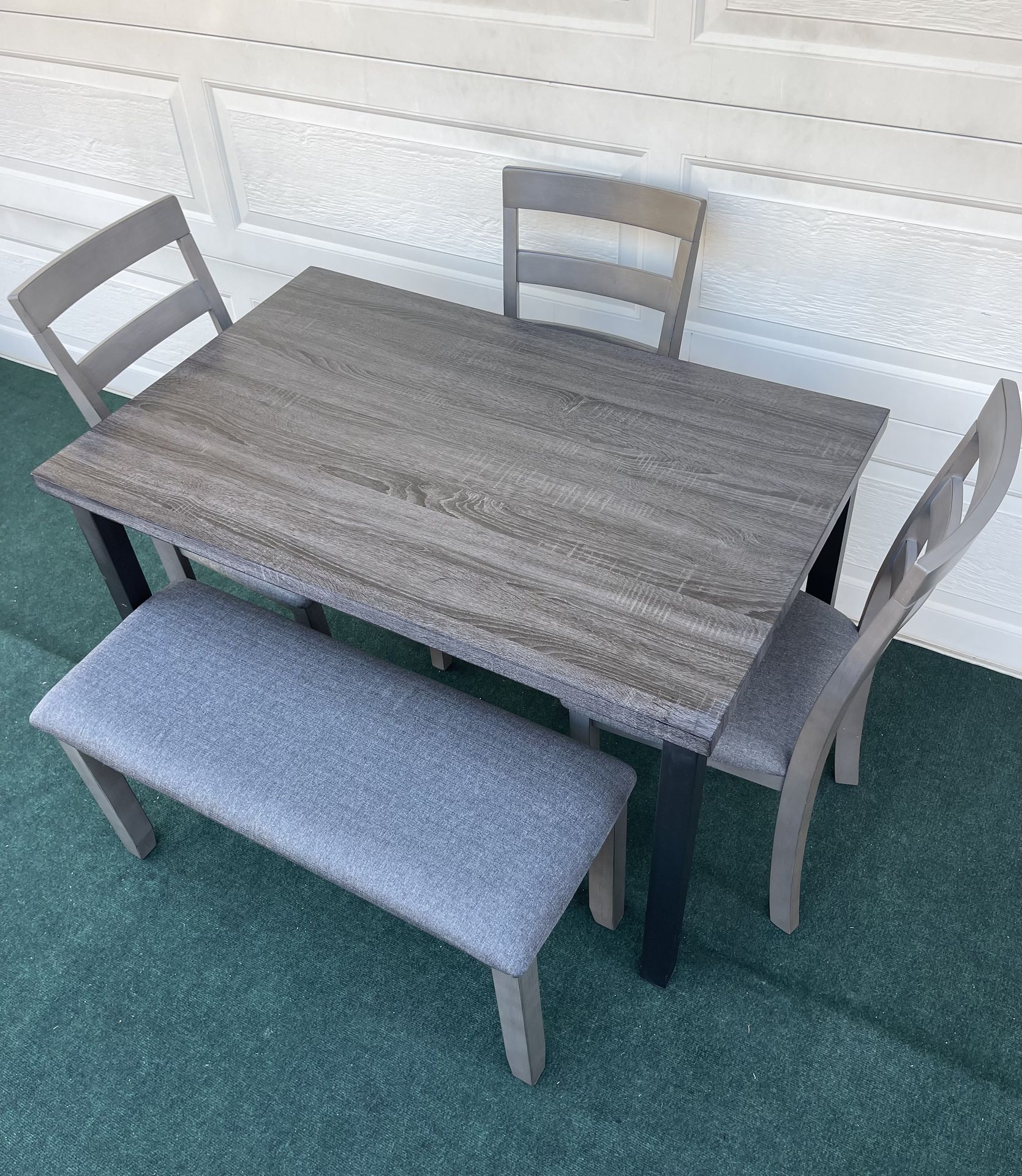 LIKE NEW 5-PC MINIMALIST LIGHT WEIGHT GRAY FINISH DINING SET (1 TABLE 3 PADDED CHAIRS AND ONE PADDED BENCH) 🔹DIMENSIONS:(48” W) x (30" D) x (30" H) 🔹PERFECT FOR APARTMENTS, SMALL DINING AREAS, STUDENT DORMS OR YOU CAN USE IT AS A KITCHEN TABLE 🔹USE IT TO COMPLETE ANY KITCHEN OR DINING ROOM The rectangle dining table set is made of a combination of rubber wood, micro fabric fiber and foam for durability and comfort This 5-Piece Dining Table Set includes: 🔹1 Gray Rectangle dining table 🔹3 Gray padded chairs 🔹1 Padded bench 🔹Excellent condition, Like new, very good looking condition. Fully assembled