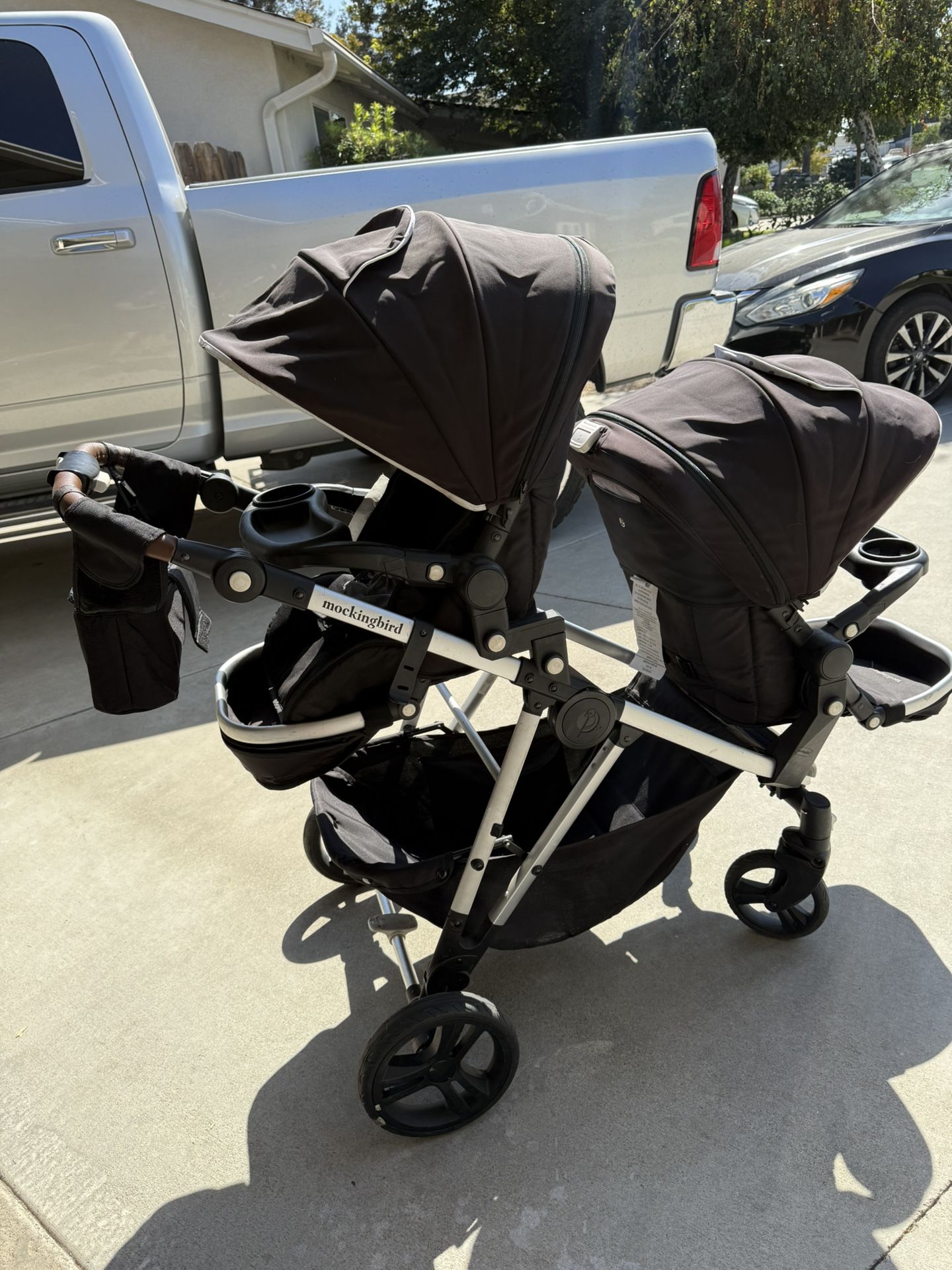$580 OBO no longer need it Mockingbird single to double stroller. Comes with 2 seats, 2 snack trays, 2 sun covers and the 2nd seat adapters. It also comes with the cat seat adapter and a cup/accessory holder. It is freshly washed. It would be like new but there are a couple stains on the inside of the canopy's.