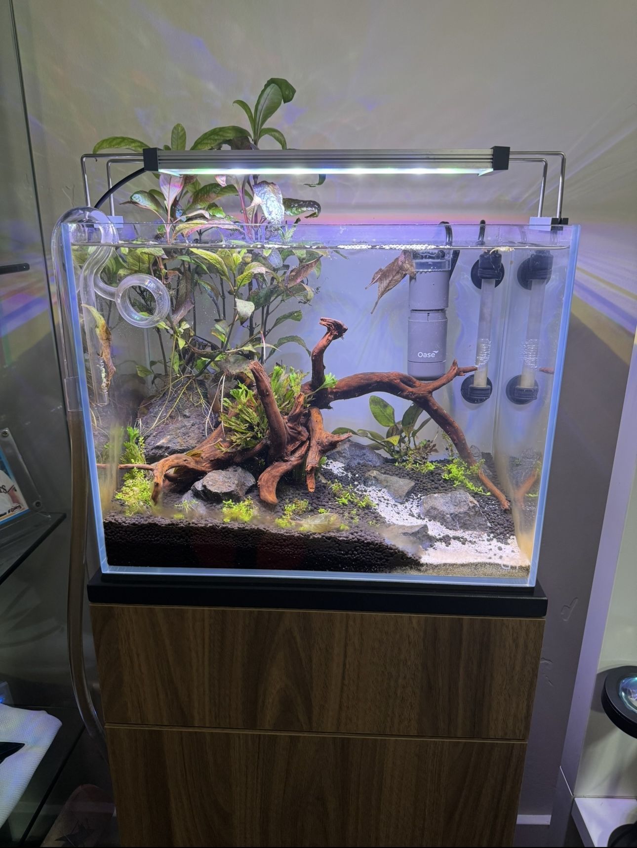 Includes: - Custom fabricated/welded steel stand. Wood door hinged from bottom to open with magnetic touch latch. Built in shelf behind top wood panel and leveling feet underneath stand - UNS 5T rimless tank with leveling mat -Twinstar B Line LED Light -Archaea mini pro heater -Oase surface skimmer -Zoo Med nano 10 canister filter -Glass lily pipes -Hardscape (wood and stones) - Will also include leftover bag of ADA sand