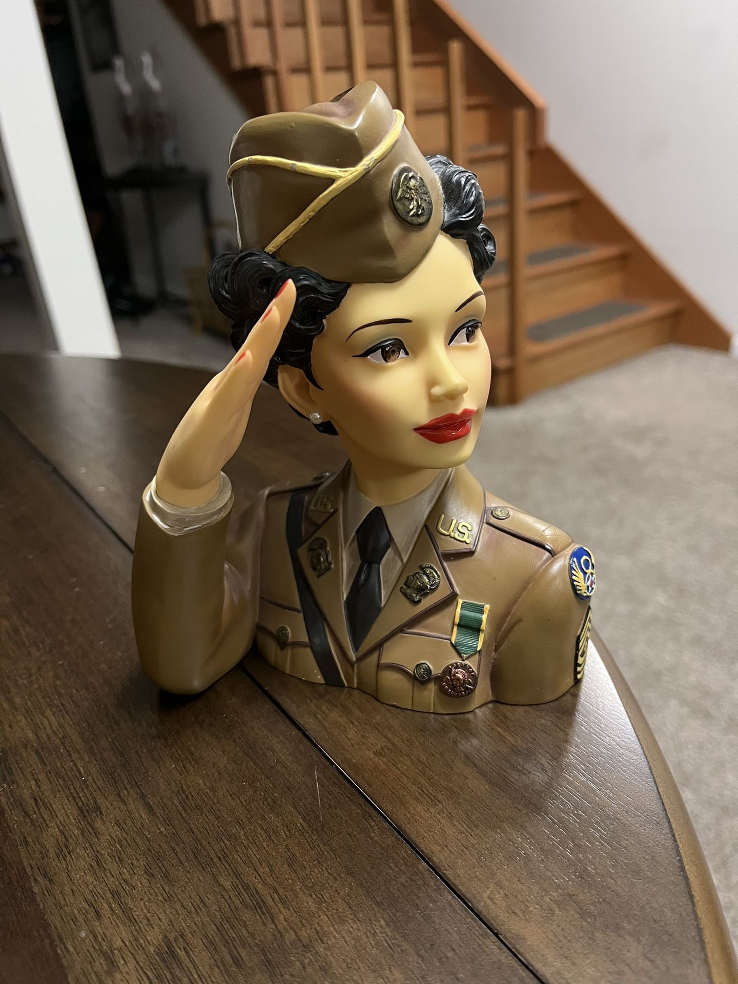 This specific version is subtitled "Welcome Attention" and depicts a woman in a World War II-era U.S. military uniform giving a salute. Brand and Series: Cameo Girls Deluxe Lady Vases Model: Martina 1942 "Welcome Attention" Year/Era: Associated with 1942 and the World War II period. The uniform suggests the Women's Army Auxiliary Corps (WAAC), which was established that year. Description: It is a bust-style head vase made of cold-cast resin, often released as a limited edition collectible item. Roughly 7” tall x 5-1/2” wide. Excellent condition.