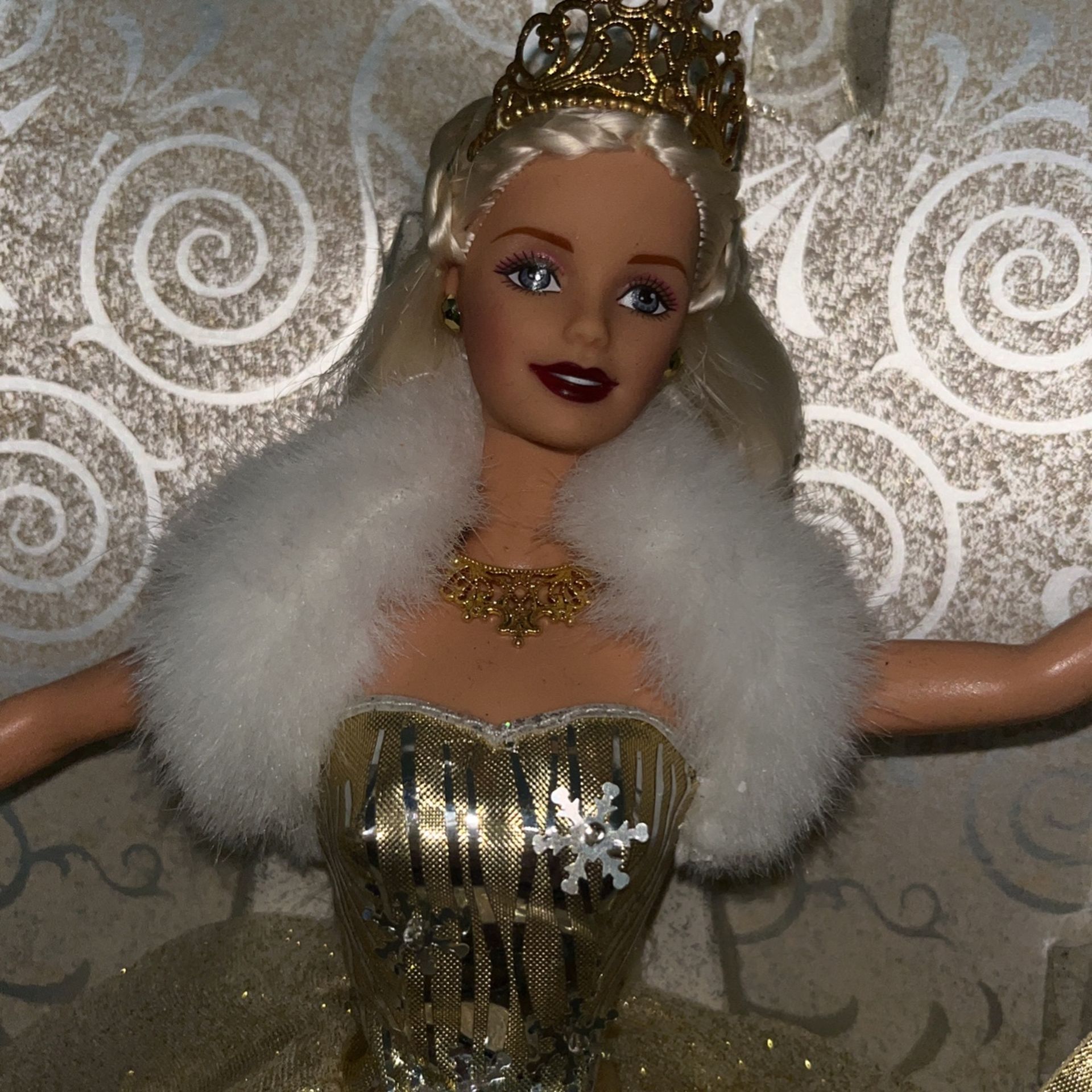 Beautiful doll still attached to her backdrop. No box just gold swirl backdrop.