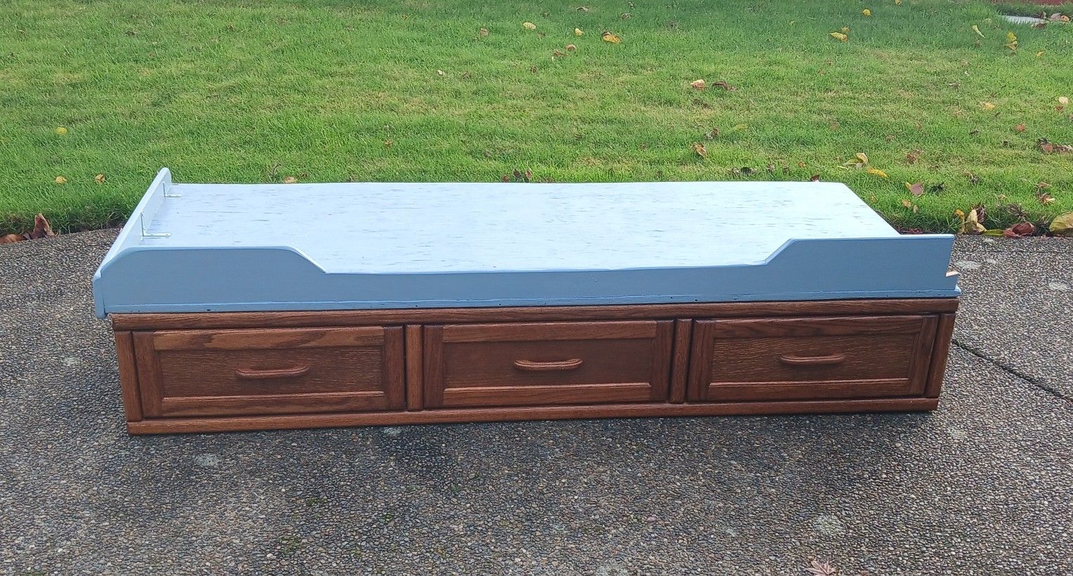 Used this three drawer captains bed section for a bed base in a truck that I sold. It has a 3/4" plywood deck to hold a mattress. A simple over the wheel well bench type configuration would accommodate a twin size mattress. The drawer base is 76" long X 20" wide X 11 1/2" tall. The drawers are 20"wide X 17 1/2" and 5" deep. Mattress board is 76 1/2" long X 32 " wide. Will sell the drawer base by itself for $40 or both pieces for $50.