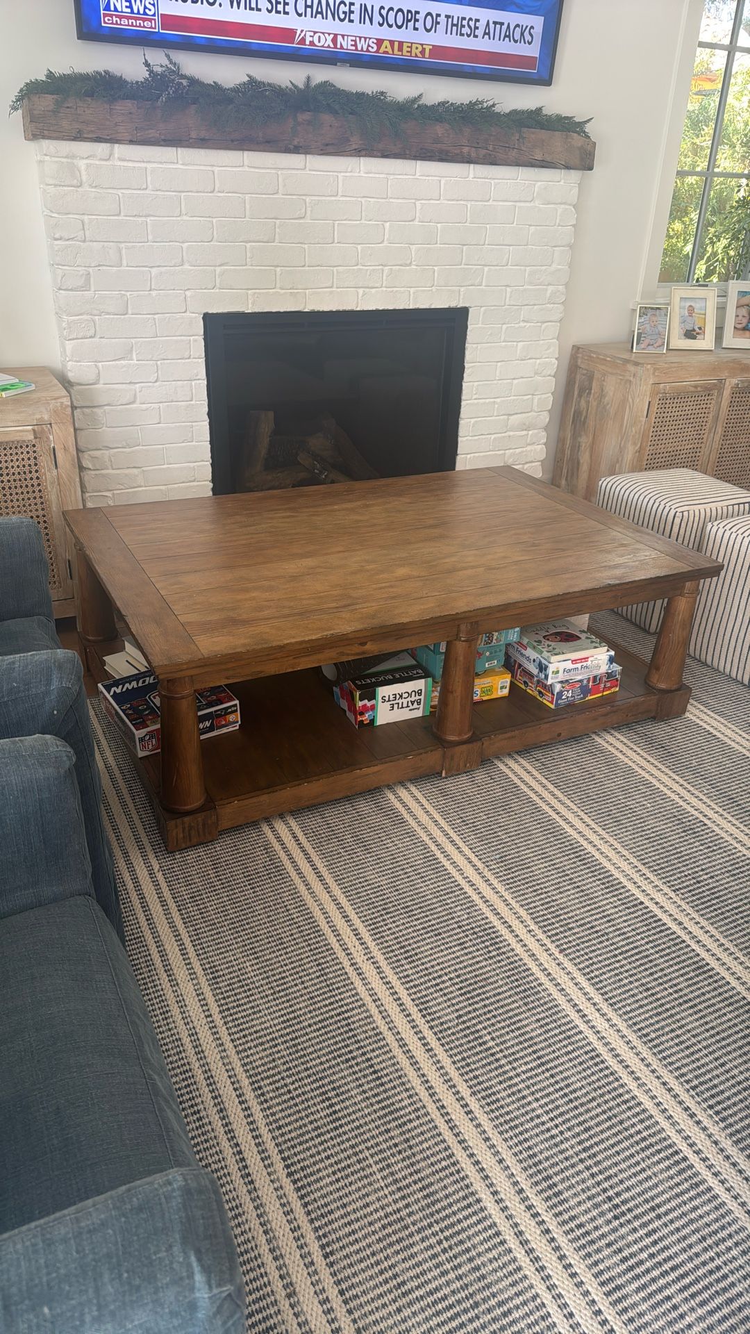 Large rectangular coffee table. Hidden wheels on legs. 5 feet x 3.5 feet.