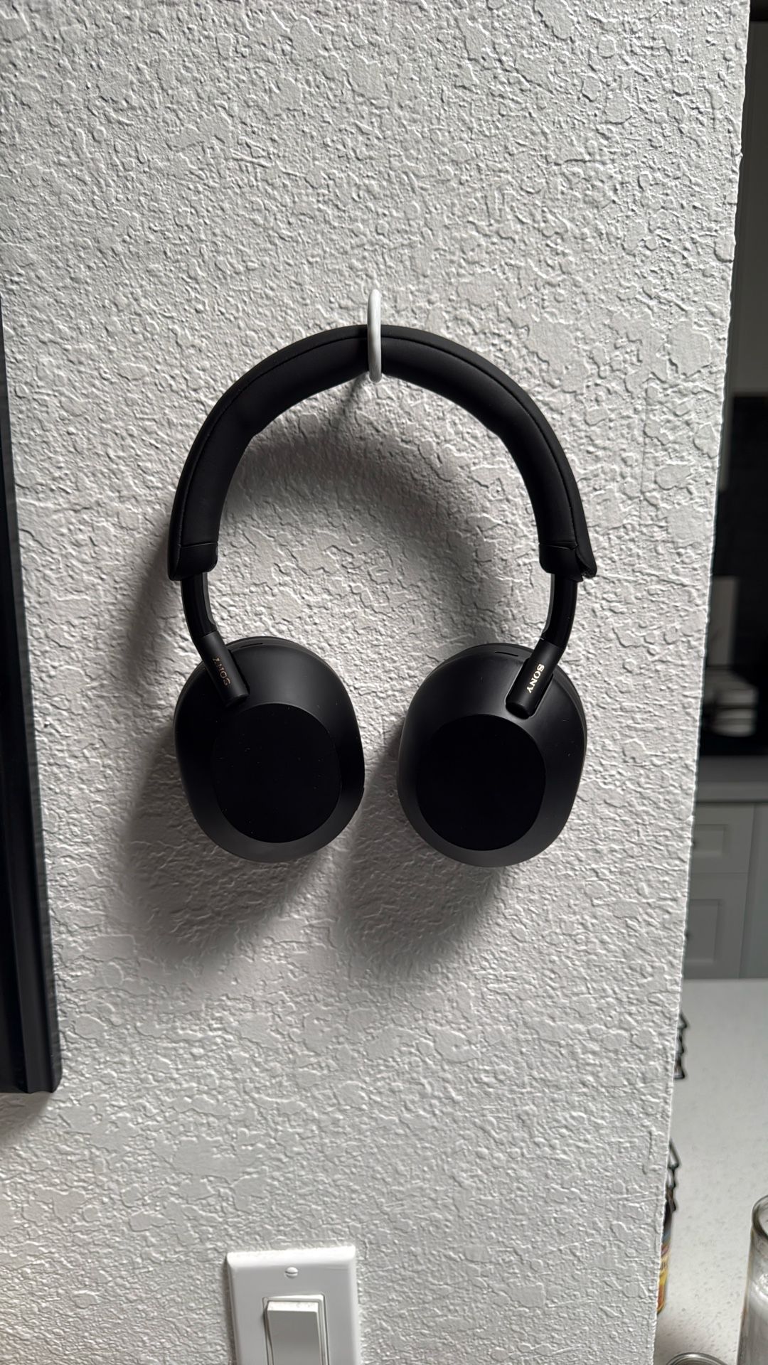 Sony WH-1000XM5 noise cancelling bluetooth headphones in black. Comes with a built in microphone, speak to chat function, noise cancelling and transparency, and a DAC cord for lossless audio. Used, slight damage to the leather but other than that audio and other functions still work perfectly