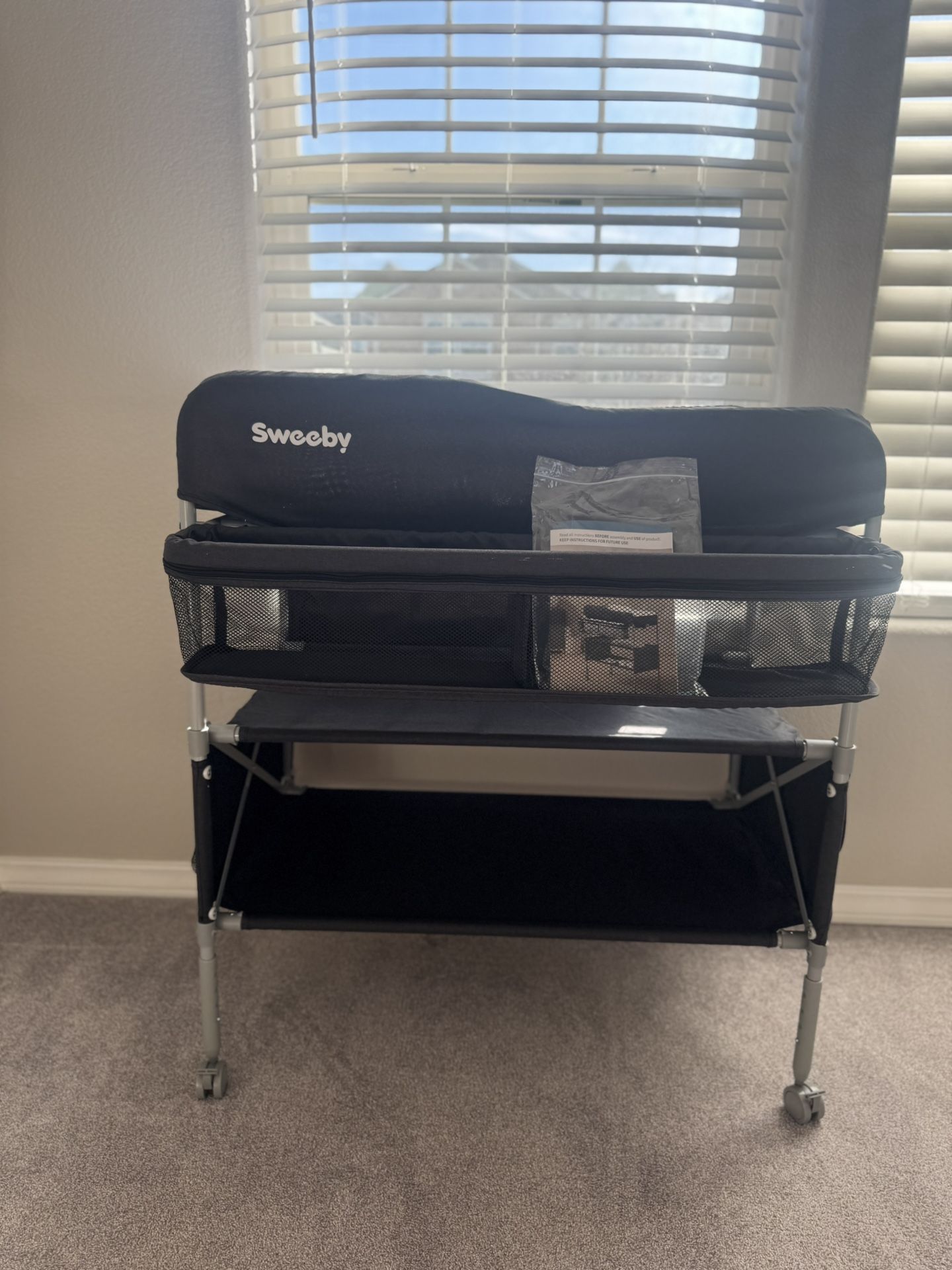 Modern Sweeby changing station table organizer with smooth rolling wheels and a sharp black finish. Very clean, freshly installed and never used. Sturdy, functional, and looks great in any nursery or bedroom. Perfect for diapers, wipes, clothes, or baby essentials. Rolls easily for convenience and locks in place when needed.