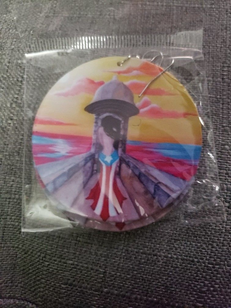 Round pierced wood earrings with puerto rican flag on a lady's dress with a beach scene with a sunset background Locally i only ship to avoid traffic and with my work and family schedules.