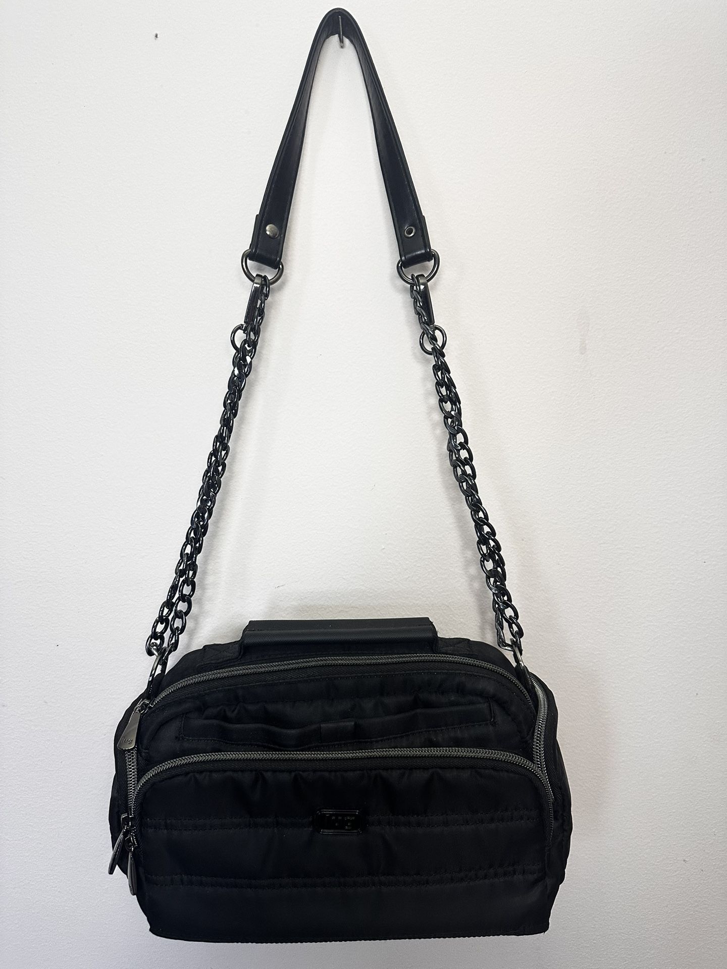 Lug Trolley Crossbody Purse in black Pockets inside pockets! Stay organized. Never lose your keys with the bungee key clip. -RFID front zipper pocket -Soft lined cell phone pocket with magnetic closure -The strap I doubled up on the sides to wear as a shoulder bag, or you can unclip & straighten to wear crossbody. Pick up in McHenry