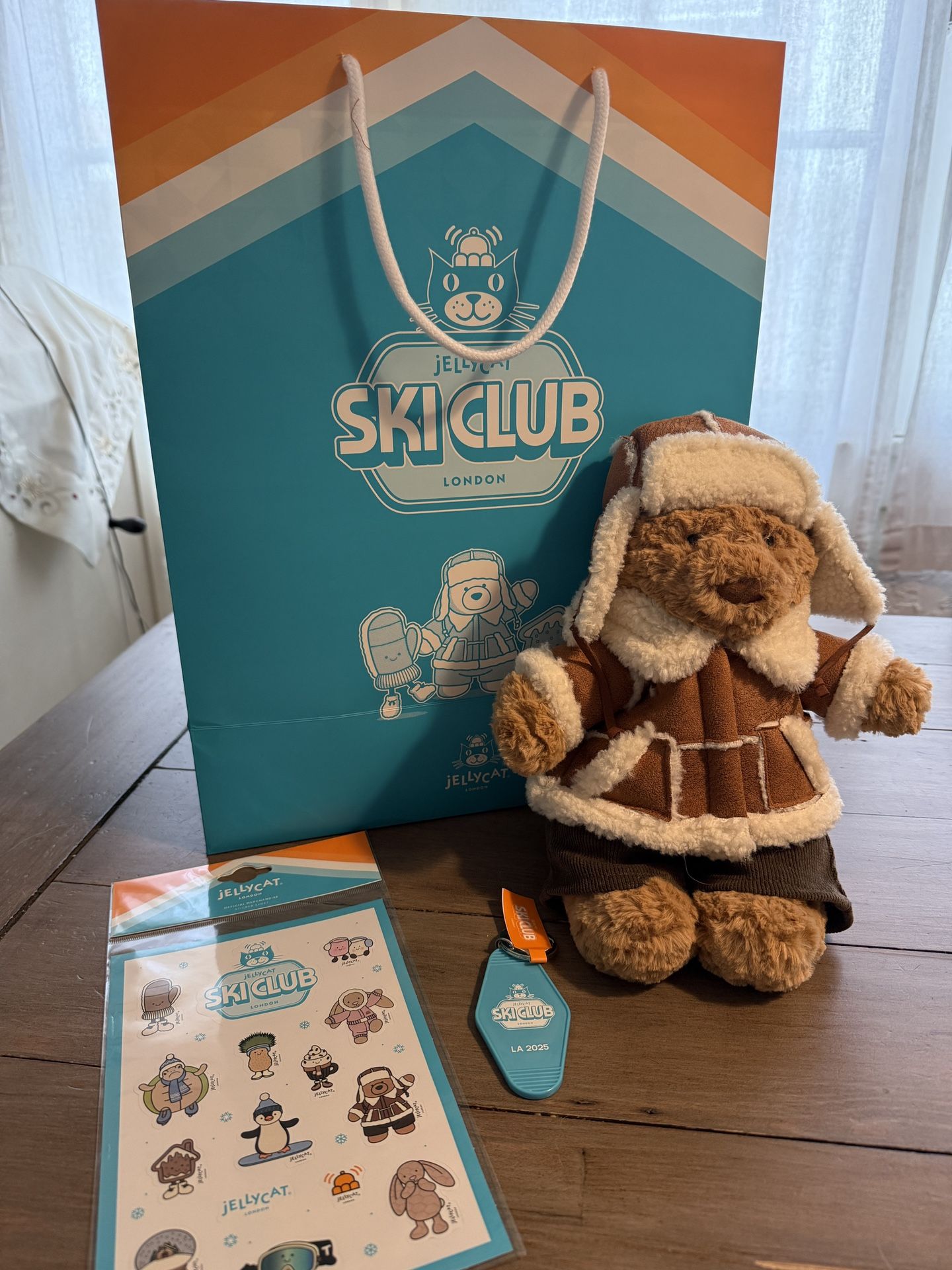 Jelly Cat Ski Club World Exclusive Bartholomew Bear Brand new with bag , sticker sheet and key chain