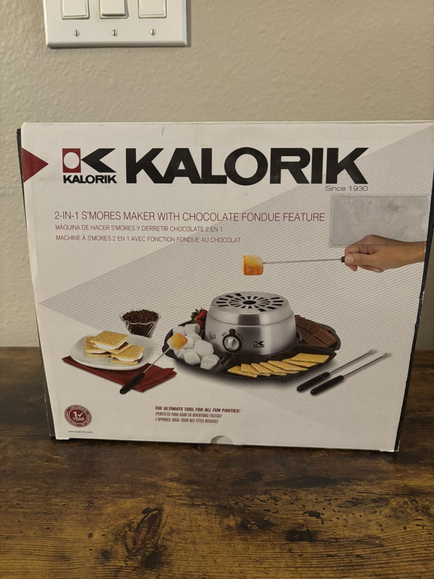 Only used once. Like new Kalorik smores maker with bonus fondue feature. Comes with 4 removable storage trays and four stainless steel forks. Only used one time. I’m in the sugarland Missouri city area.