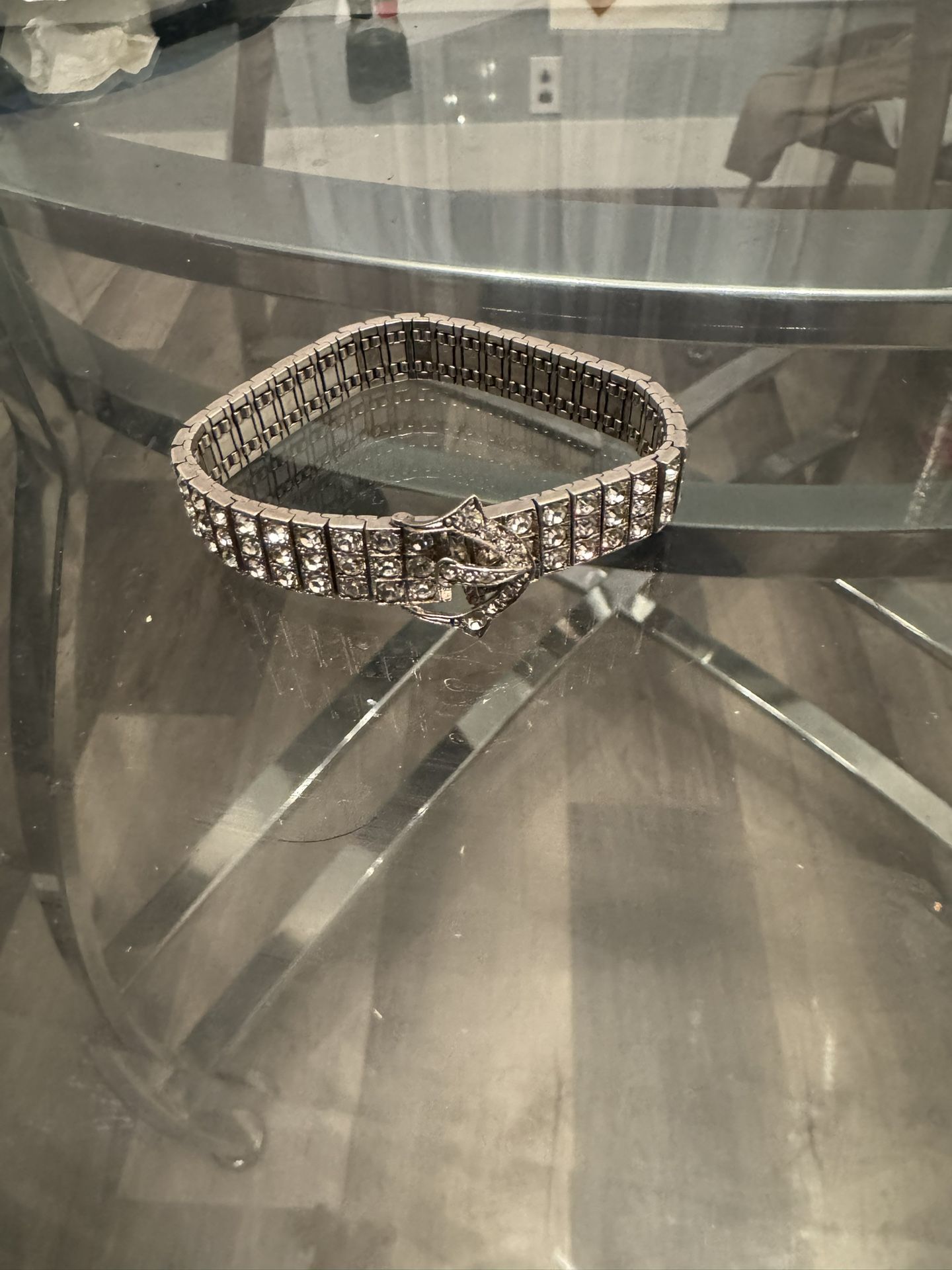Selling Sterling silver Art Deco era rhinestone triple row bracelet, neat buckle motif, measures 7 inches in. Barely used