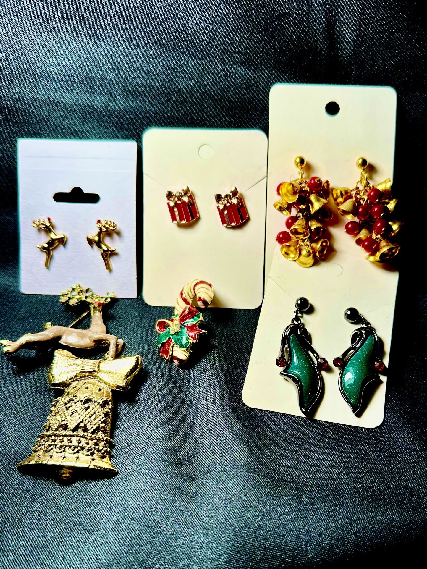 VINTAGE 7 PIECES OF MISCELLANEOUS CHRISTMAS EARRINGS &PINS/BROOCHES