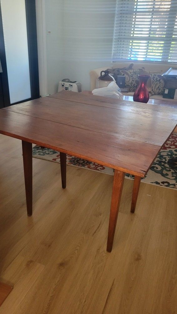 Vintage solid wood table with clean, simple lines and a warm natural wood finish. Sturdy and well-built, ideal as a dining table, breakfast table, or workspace. Shows visible signs of age and use consistent with vintage furniture (surface wear, marks, and patina), which add to its character. Structurally solid and stable. Dimensions: Height: 29 inches Length: 37 inches Width (fully open): 36 inches Width (with drop leaves down): 17 inches Drop-leaf design allows compact storage and flexible use. Sold as-is. Local pickup only. Priced to sell.