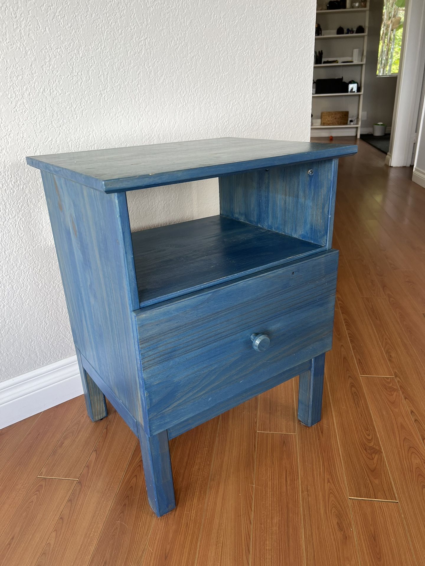 IKEA wooden side table will shelf and drawer. Blue stained for a coastal look. Top has some surface scratches, see photo. L: 19” W: 15 1/4” H: 24 3/4”