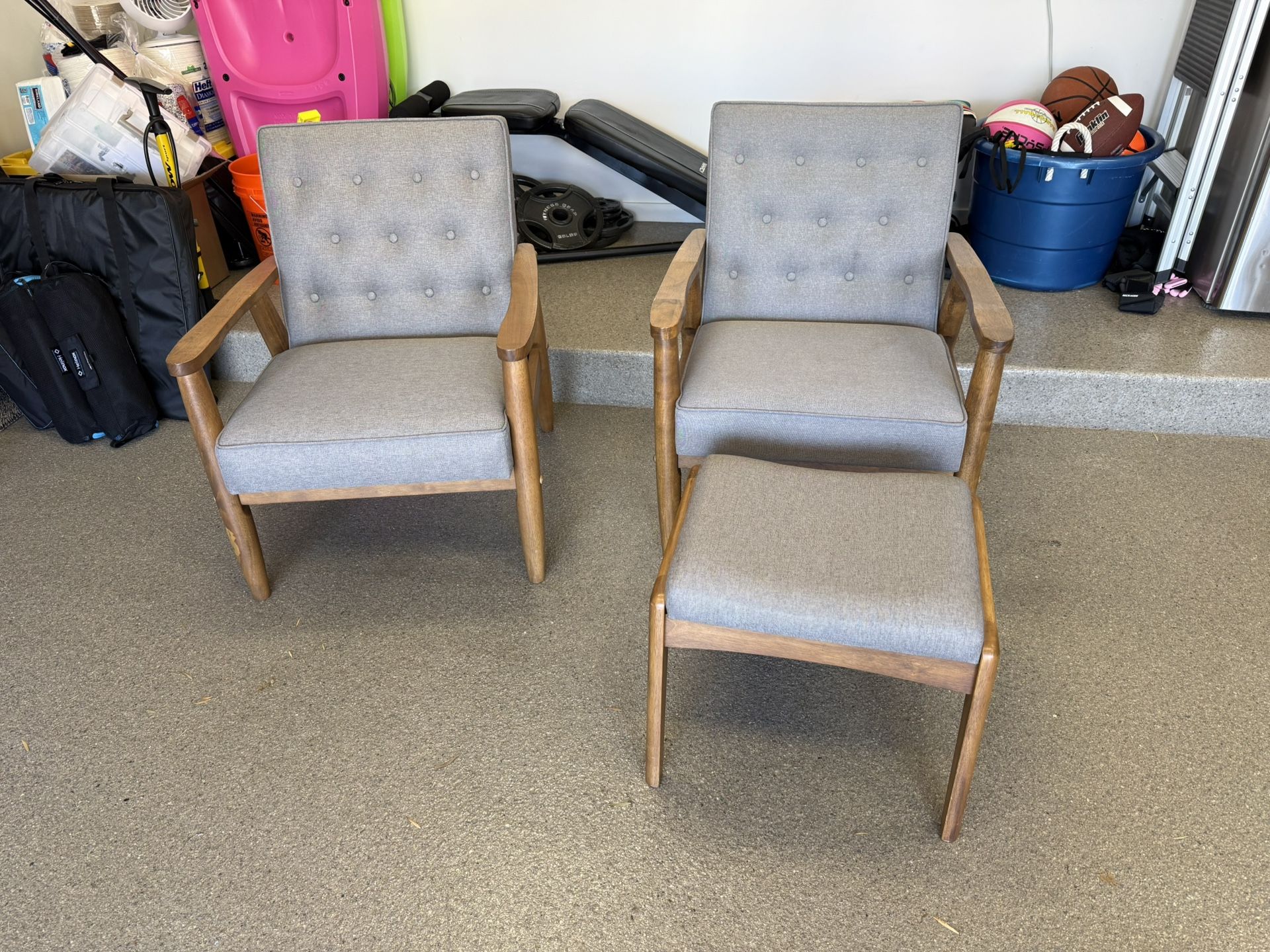 Two Baxton Studio Sorrento Mid-Century Retro Modern Fabric Upholstered Wooden Lounge Chair, Grey And Footstool
