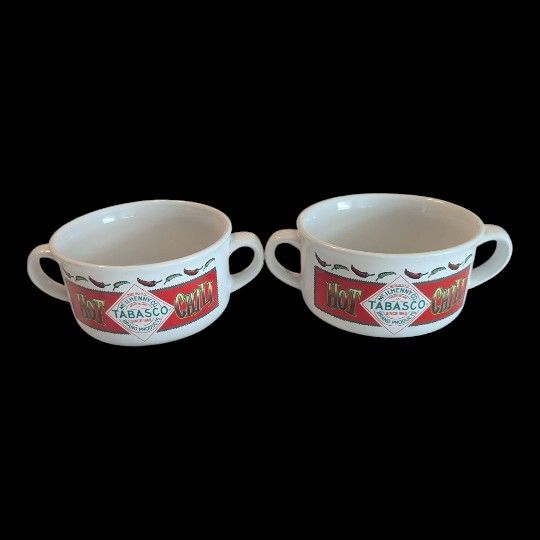 Vintage Collectable Set Of 2 Ceramic McIHENNEY CO. TABASCO 2 Handled Chili Soup Stew Bowls Cups Mugs Price Is For The 2 Bowls Cups Or Mugs. Brand: McIHENNEY CO. Type: Vintage Collectable Color: White, Red, Green, Yellow Marked On Front And Back: HOT CHILI MADE IN U.S.A McIHENNEY CO. AVERY ISLAND LA. TABASCO® BRAND PRODUCTS SINCE 1868 Bottom Marked: PRODUCED FOR HOUSTON HARVEST GIFT PRODUCTS LLC DISHWASHER & MICROWAVE SAFE MADE IN CHINA FRANKLIN PARK, IL 60131 TABASCO® is a registered trademark and servicemark exclusively of McIIhenny Company, Avery Island, LA 70513. Item #31732 (Center Logo) Houston Harvest Gift Products® Approximate Measurements 5"L x 7"W x 2.5"H Each Bowl Excellent Pre-owned Vintage Condition. No Chips, Cracks Or Crazing. I'm The Original Owner. From Smoke Free Household. Cash Or Pickup Or Offerup In App Purchase With Shipping