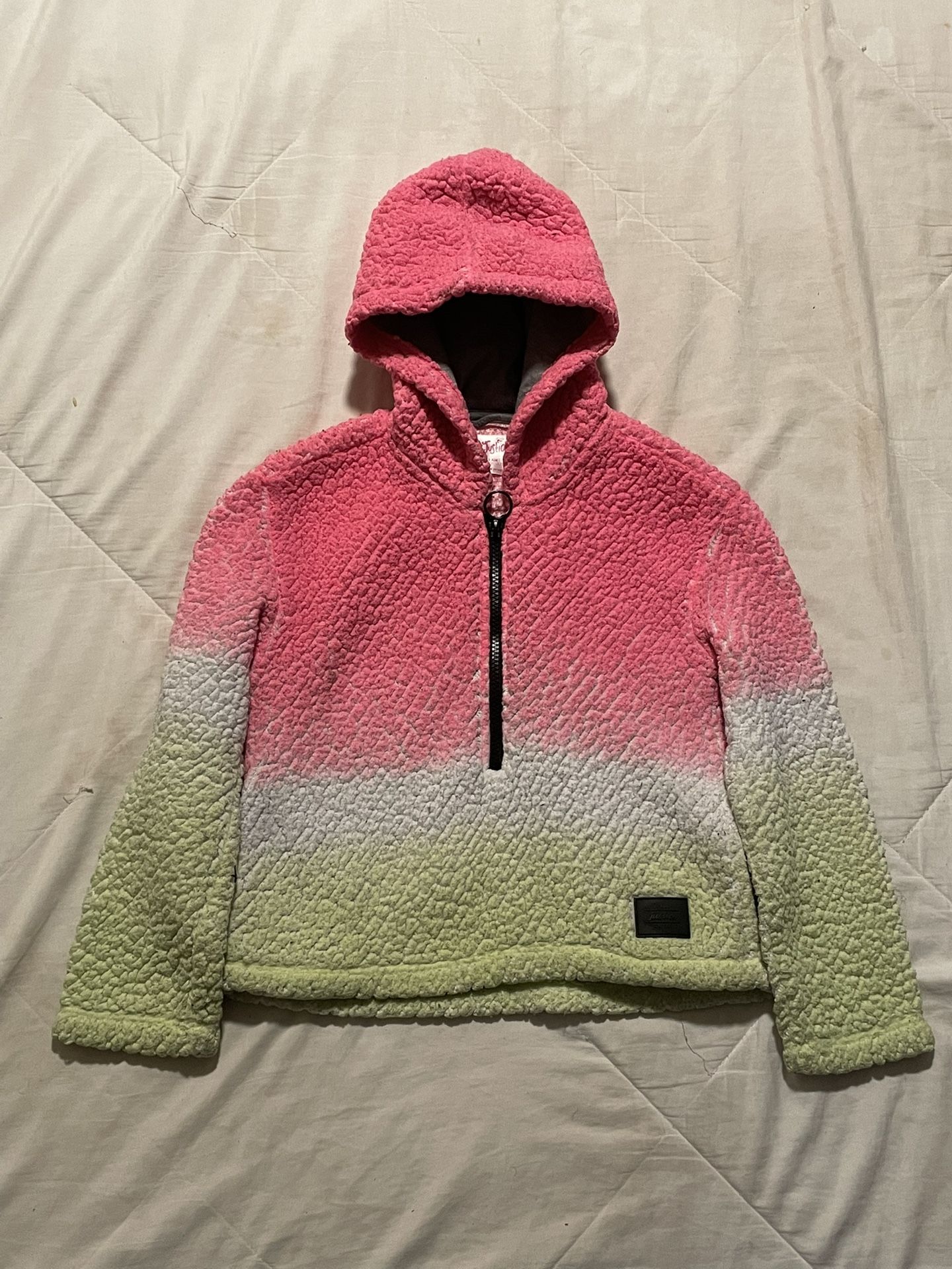 A big fluffy hoodie multi color dye pink, green and white, from brand Justice with a big quartz zipper size S 7/8 and very good and comfy to wear.